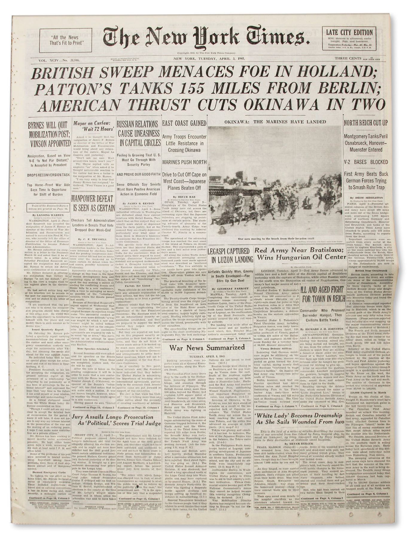''The New York Times'' 2 April 1945 edition. Newspaper reports on the tenth army meeting light Japanese resistance while invading Okinawa's main island Ryukyus, with headline ''Americans Invade Okinawa in Ryukyus; First Resistance Light''. Features front page Okinawa map with U.S. troop progress headlined ''Principal Island in Chain at Japan's Doorstep is Invaded''. Includes inset map with Okinawa's location in relation to Japan and Tokyo. Additional story reports on 200 Japanese civilians committing suicide believing ''death is better than the fate which awaits them at the hands of the western barbarians.'' 38pp. measure 16.5'' x 22.5''. Pinholes along edge, else near fine.