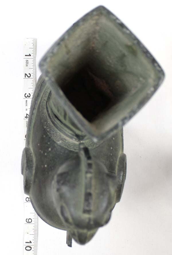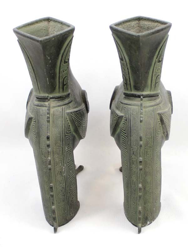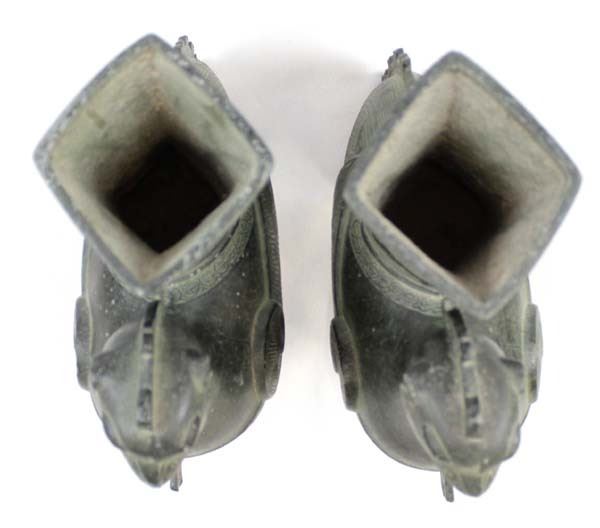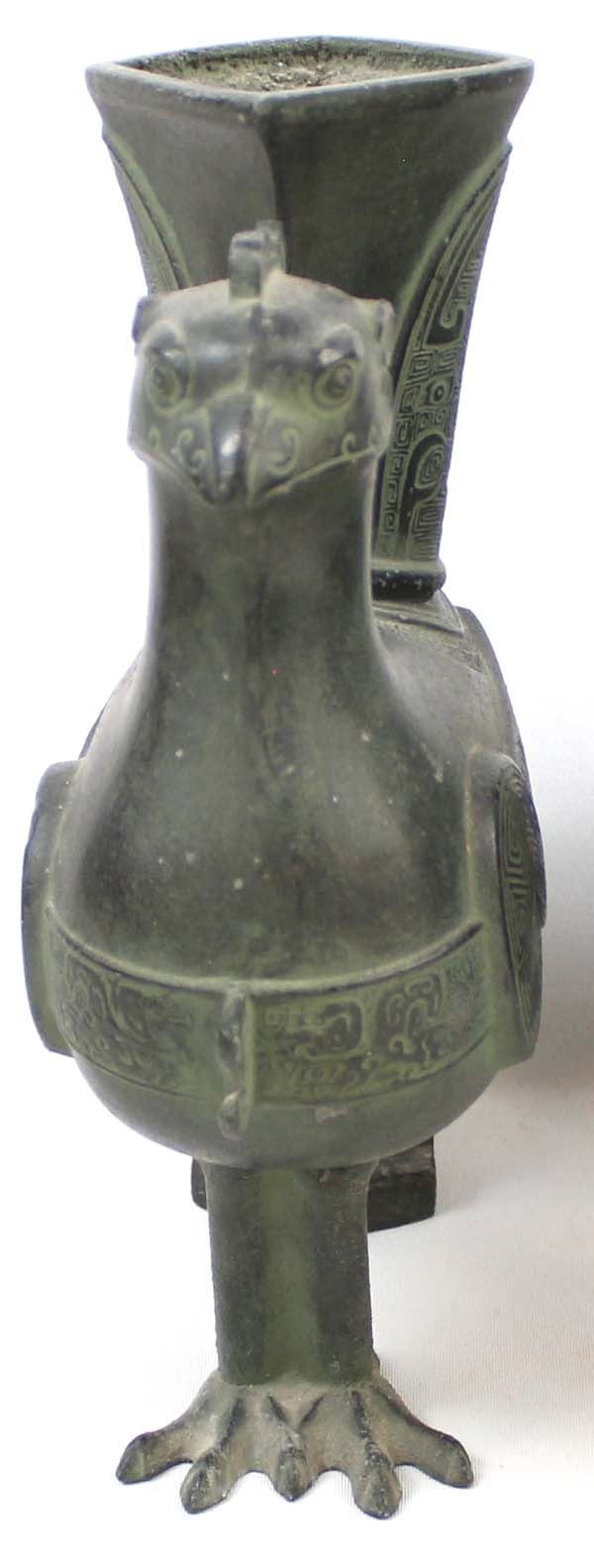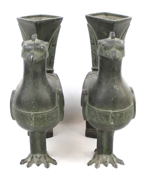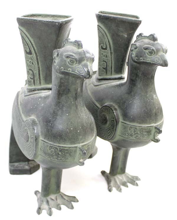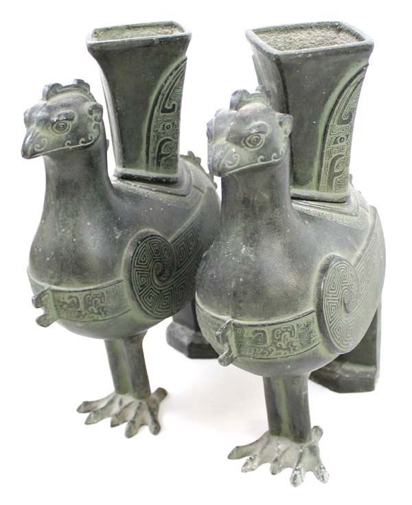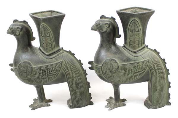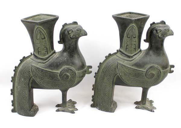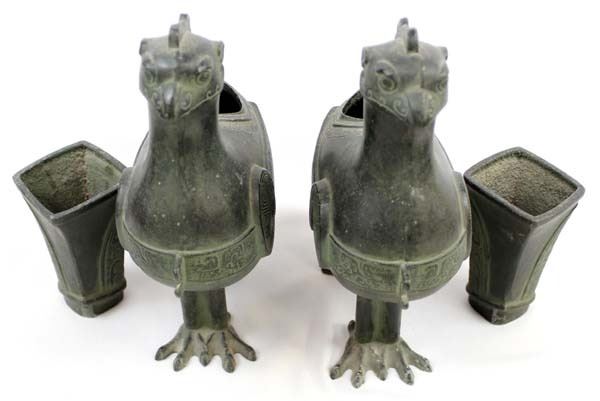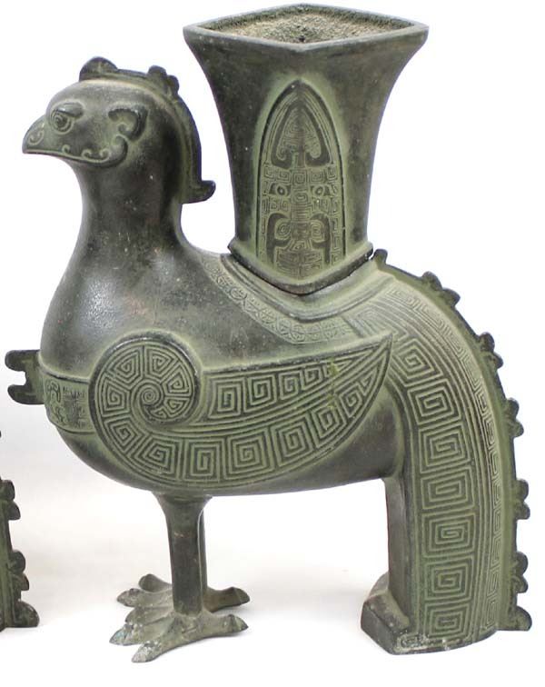 2 Archaistic Chinese Bronze Stylized Phoenix Form Ritual Vessels/Censors, notched feet, geometric patterned bands to the body, with a flared urn to the back in two parts, each measures 10'' x 9.5'' x 4''