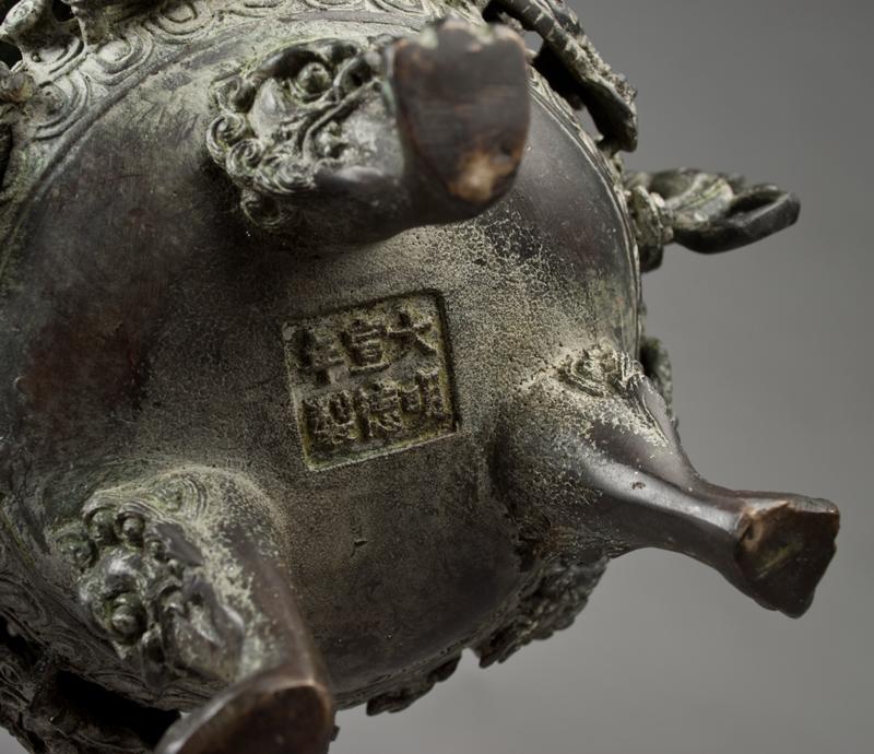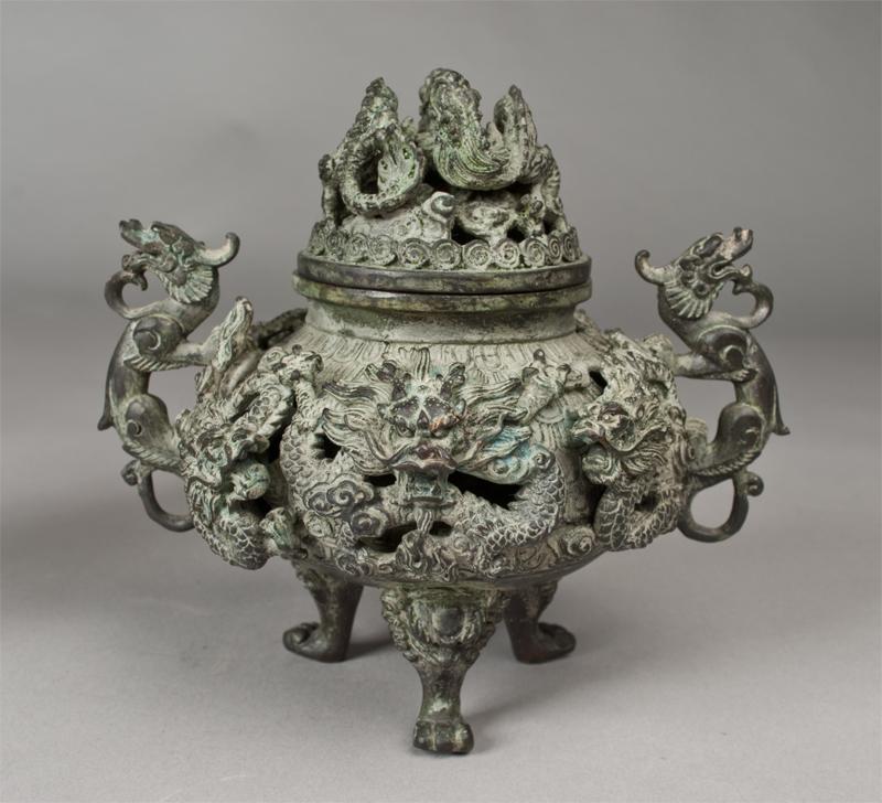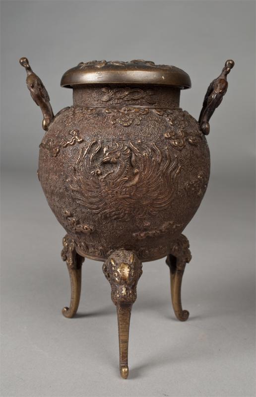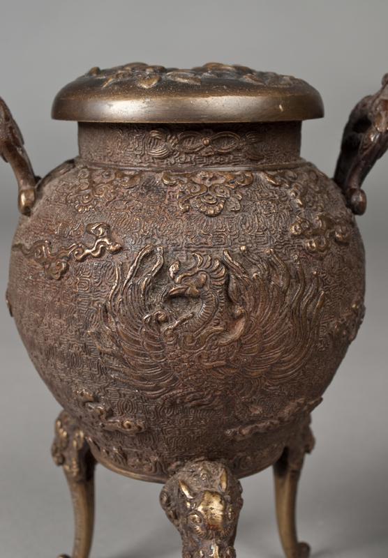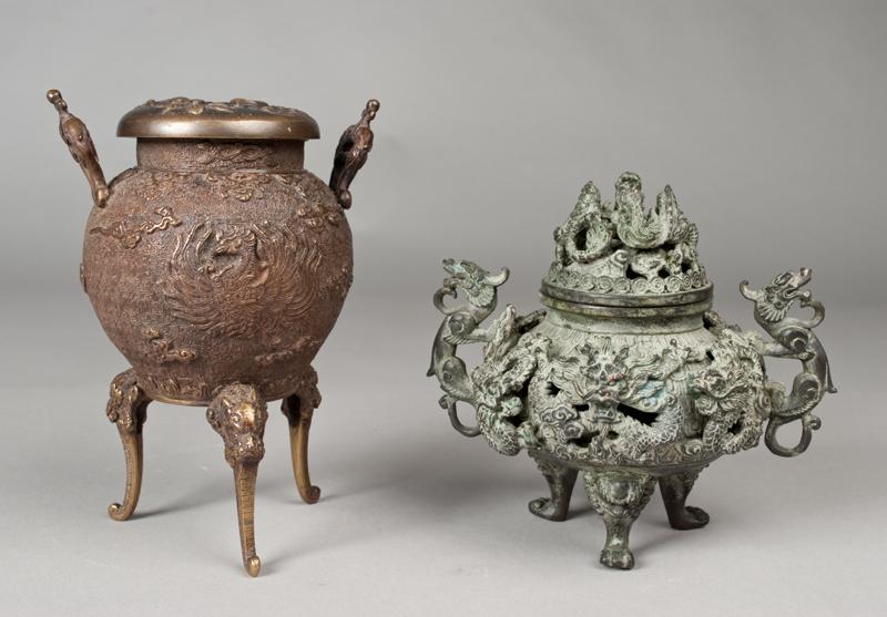 One Chinese bronze censor decorated with raised dragons, the two handles in the form of dragons, 6.5"H, and one Japanese bronze censor decorated with a phoenix and dragons, with two handles, both resting on three feet, circa early 20th century.