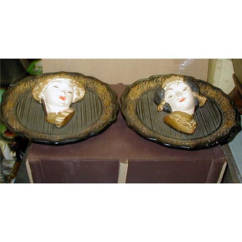 2 Black and gold trim asian ( not sure if chinese or japanese) hanging plaques with scalloped edge. A man and a woman appears to be chalkware. There is minor color loss on the fronts, but more on the back. Has a hook embedded for handing. Buyer pays shipping and handling costs.