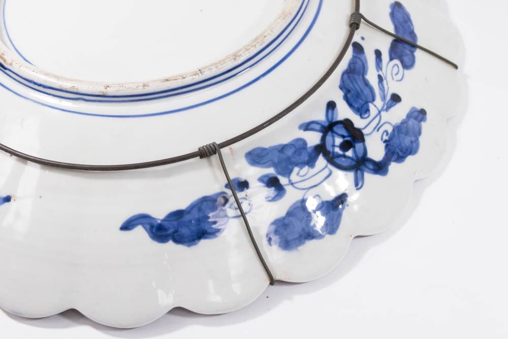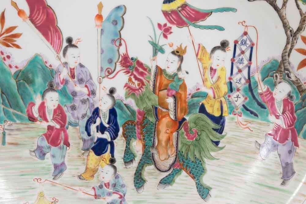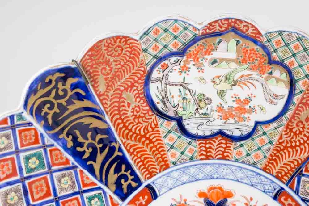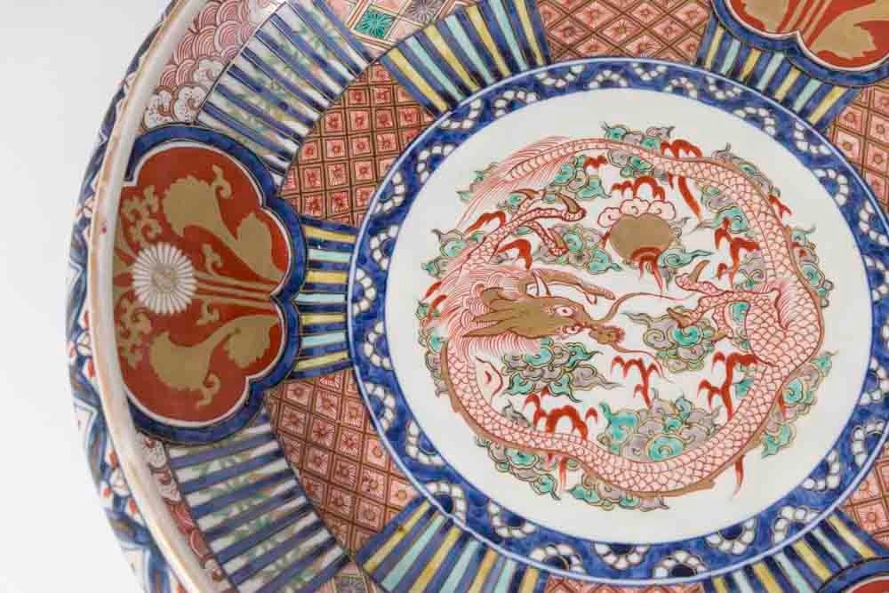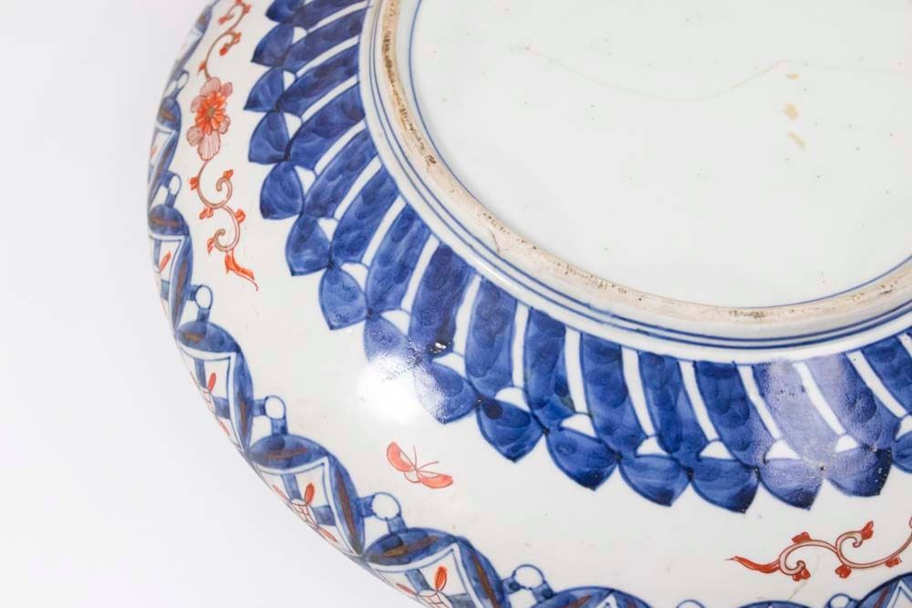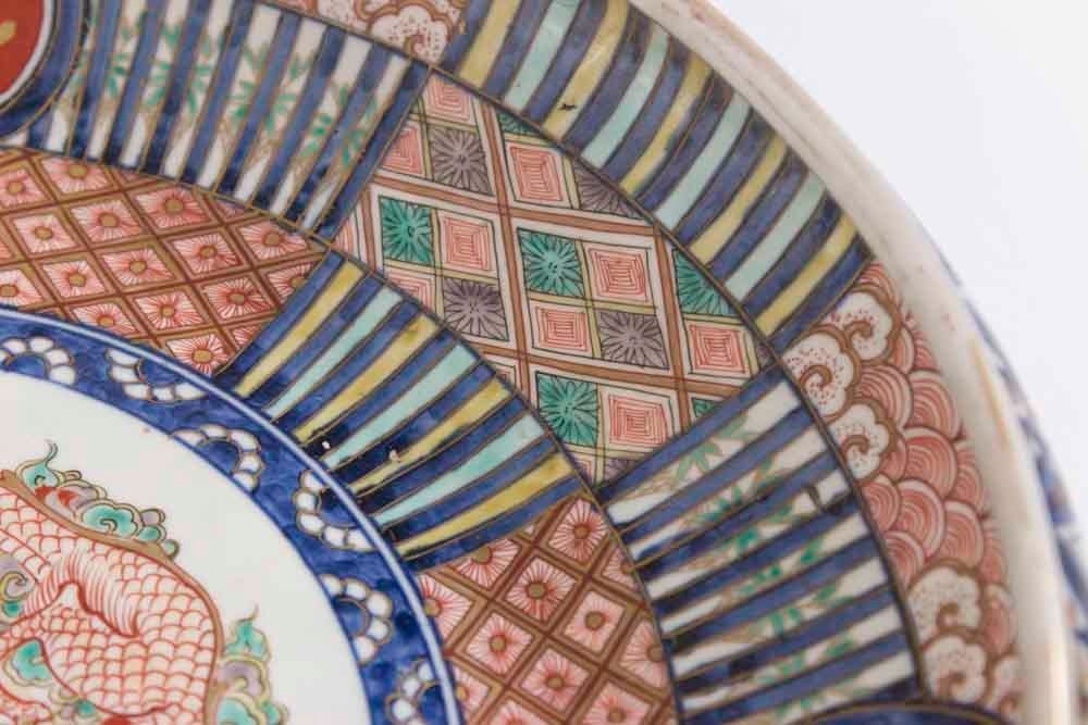 Chargers - Imari pattern and figural. Approx. 18" D, 16" D, and 14 1/2" D. Line inside bowl.