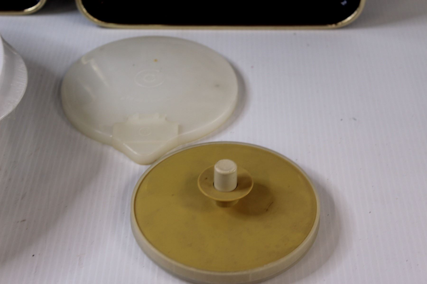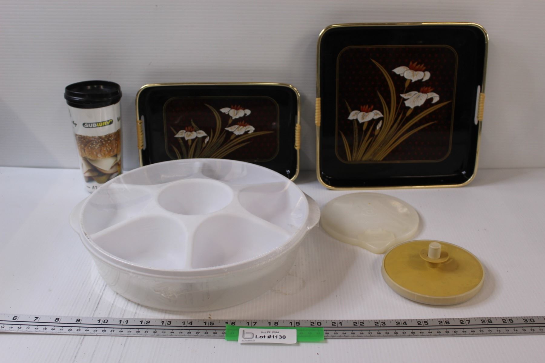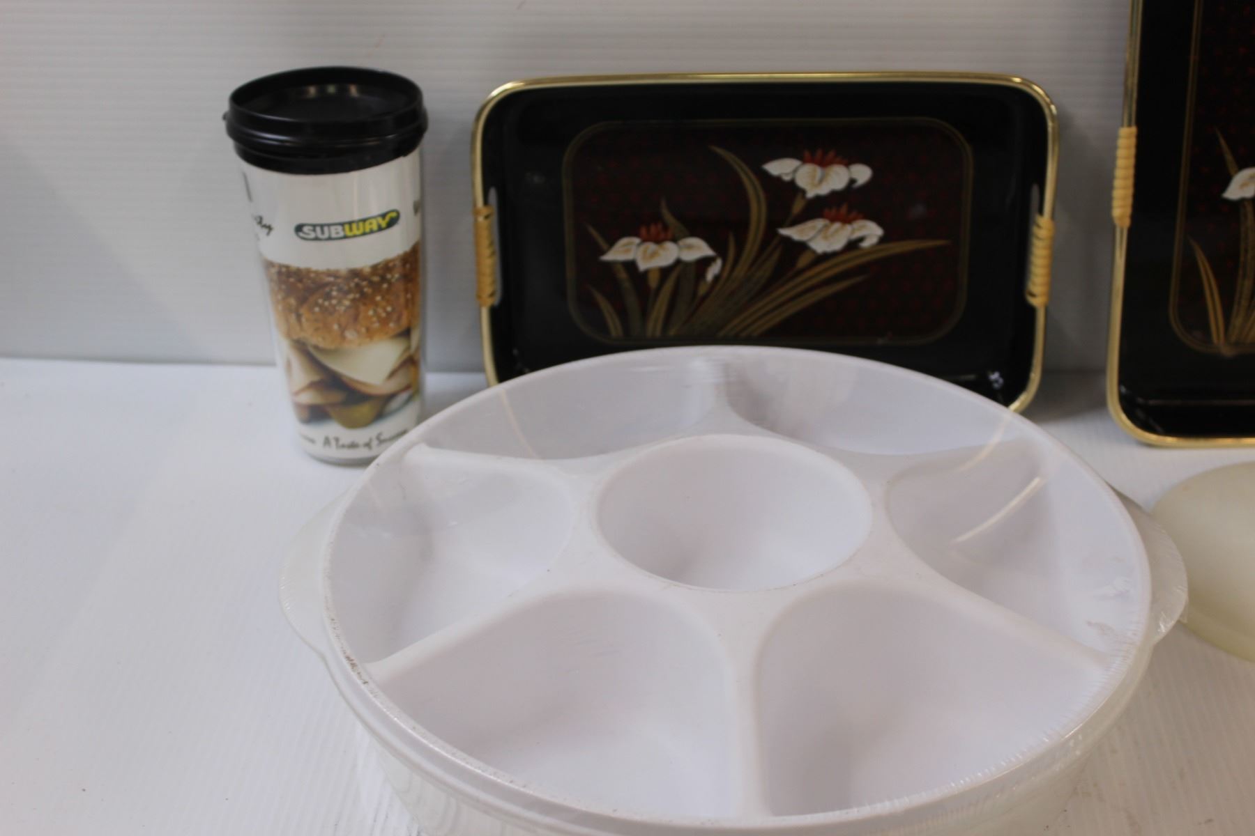 (2) Asian Plastic Serving Trays, White Sectioned Serving Tray w/Lid, (2) Tupperware Lids, Subway Travel Mug