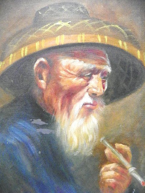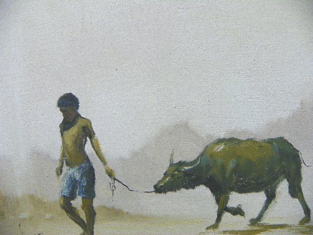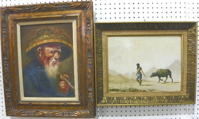 1-framed 24" x 20" oil on canvas "Portrait of Old Man" signed K.K. Wang. 1-framed 17" x 20" "Boy with Water Buffalo" oil on canvas, unsigned. Please read our terms of sale.