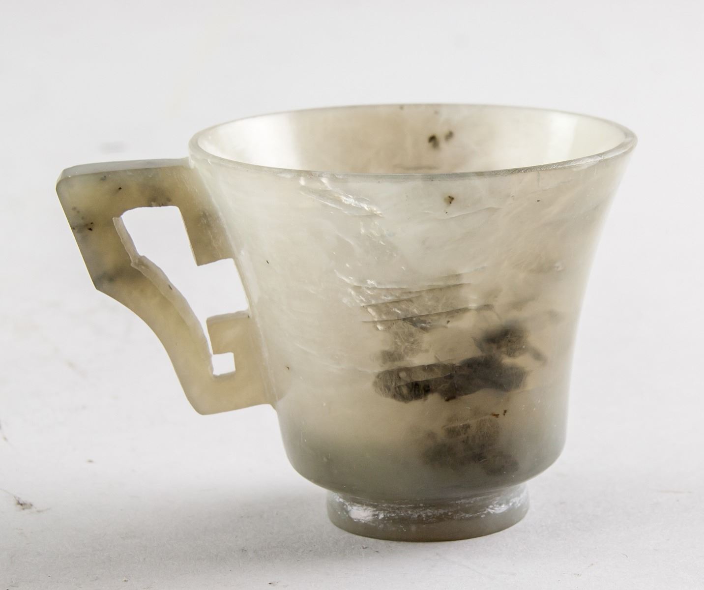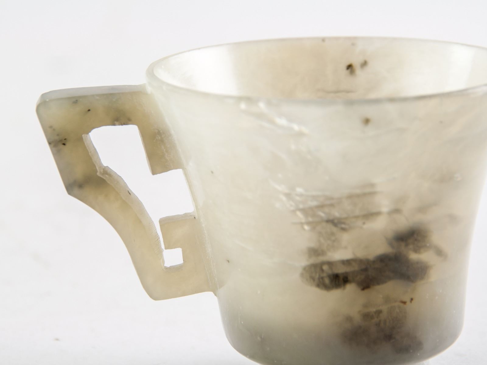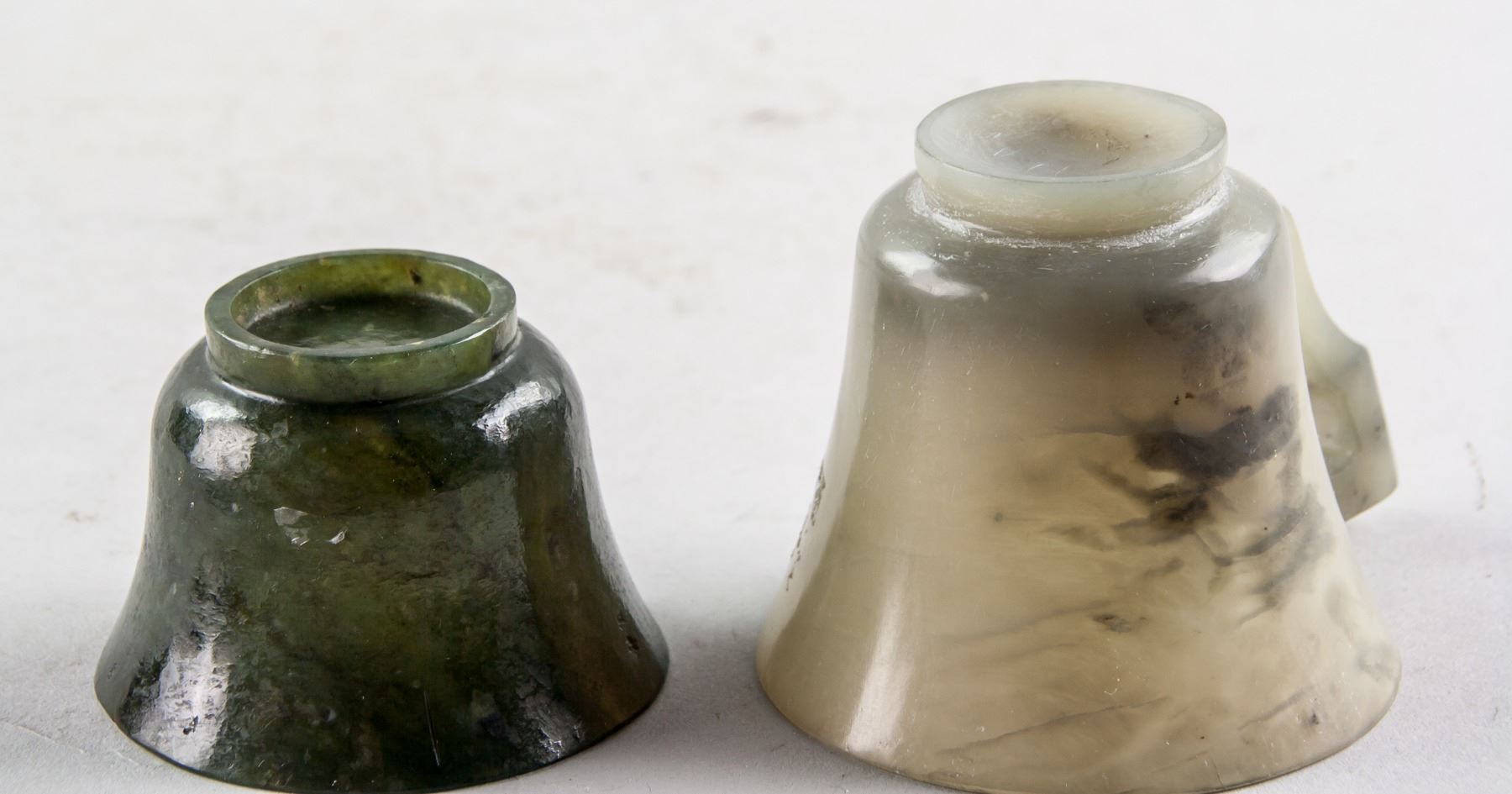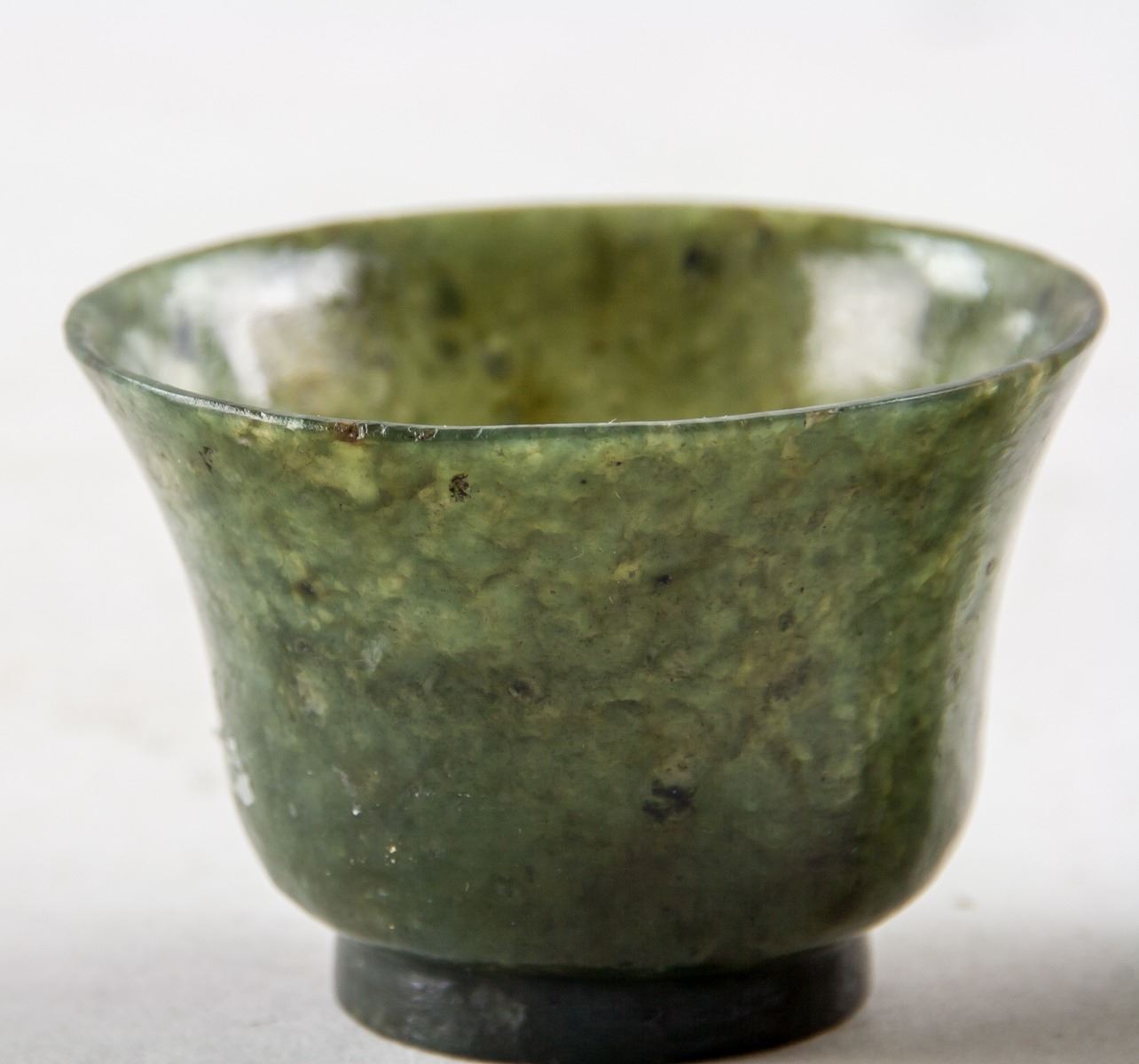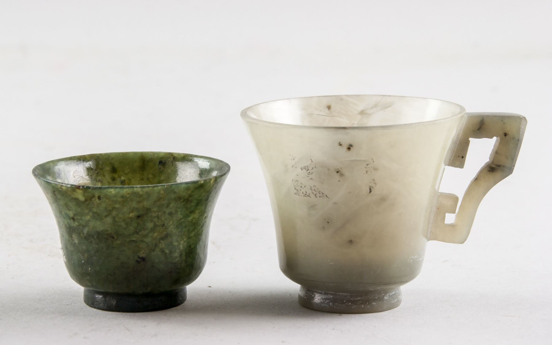 Two (2) assorted Burma jadeite carved cups, of rounded edge, tapering to bottom, supported on short foot rim, one with handle, 4-5.5 x 5.5 - 8 cm, 11 grams