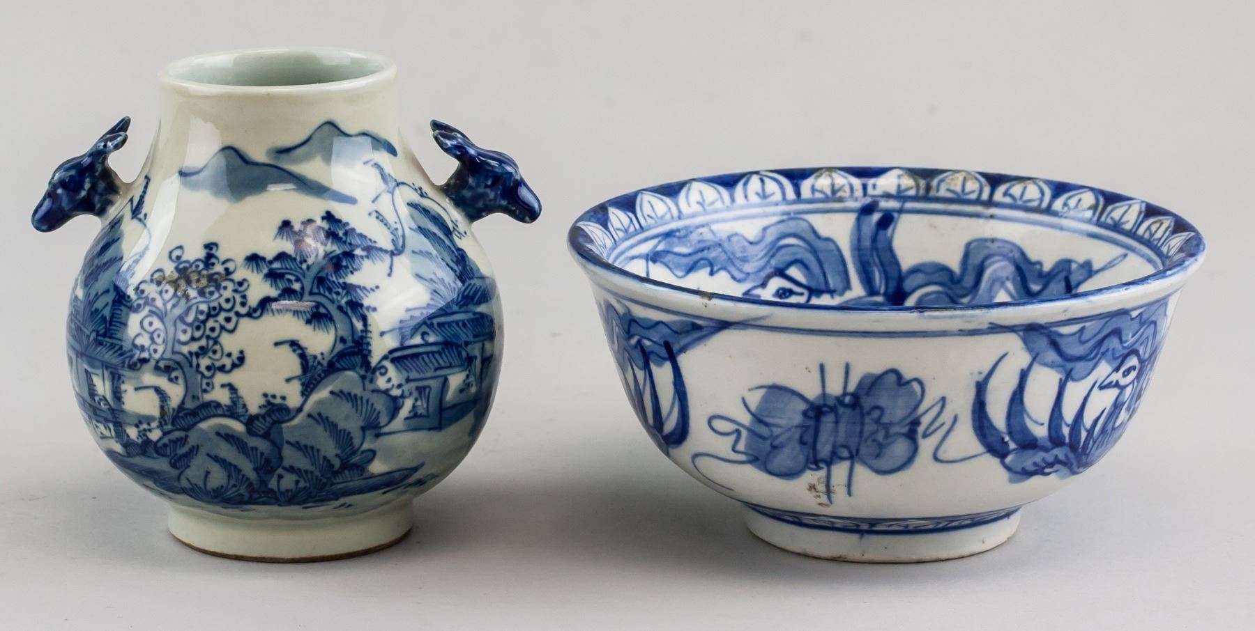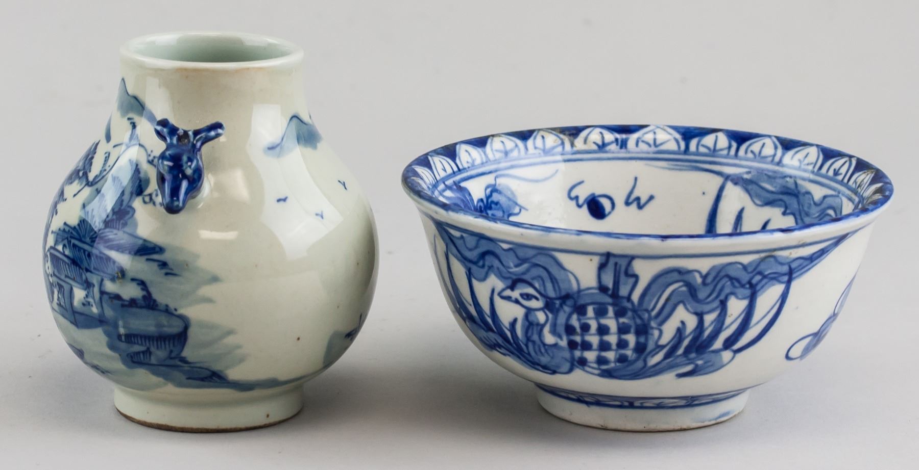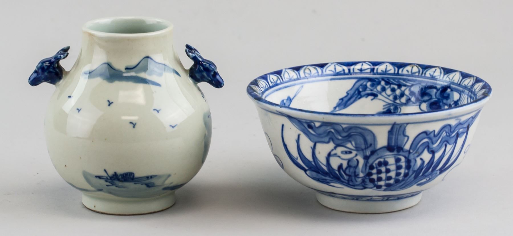 Two (2) assorted Chinese blue and white porcelain items. One bowl painted with birds and flowers. One vase with deer head handles, painted with mountainous landscape. 8 x 14 cm, 489 grams total