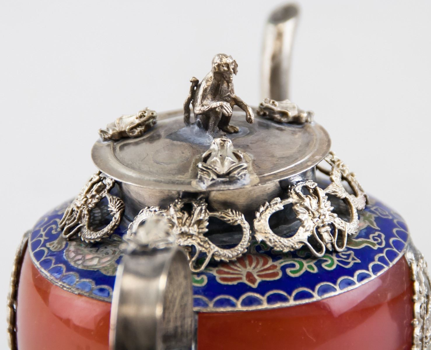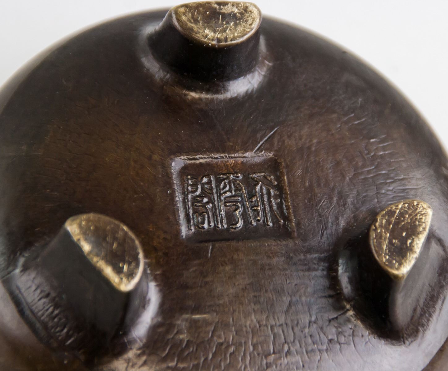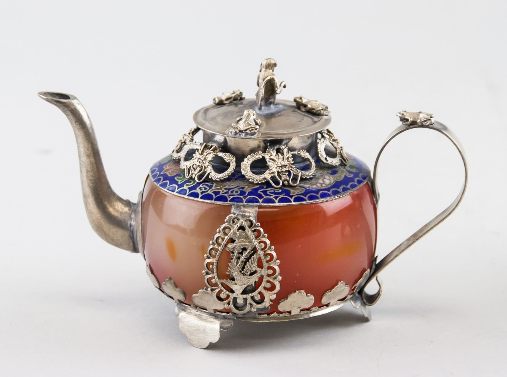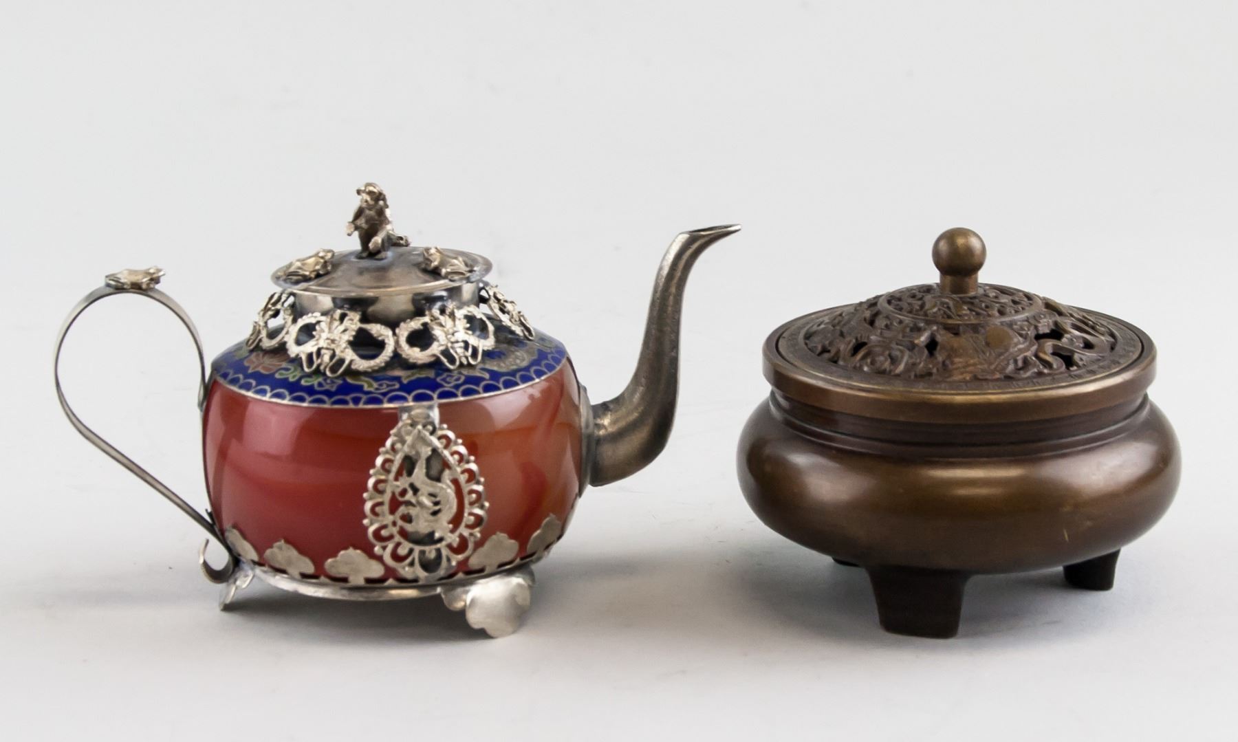 Two (2) assorted Chinese bronze items. One cloisonne teapot, with dragon carving decorations. One bronze censer with lid, with three-character mark on base. 9 x 14 cm, 750 grams total
