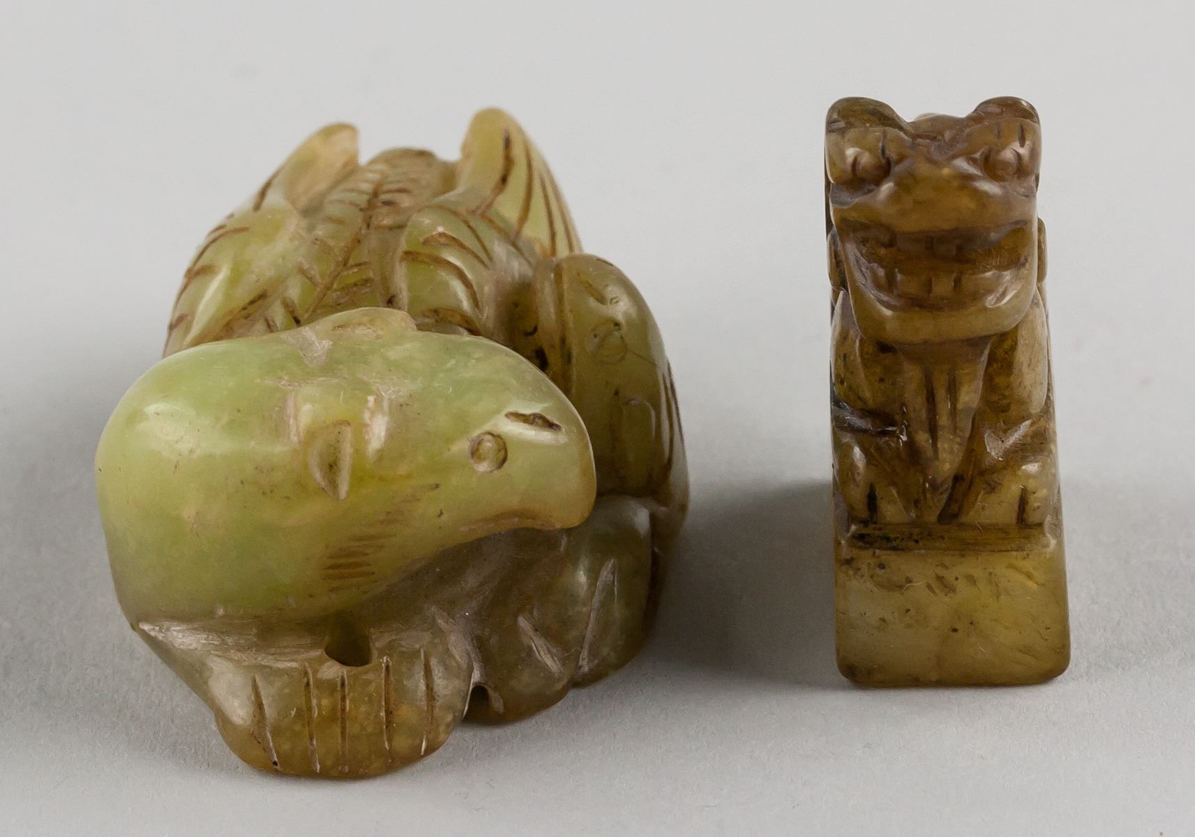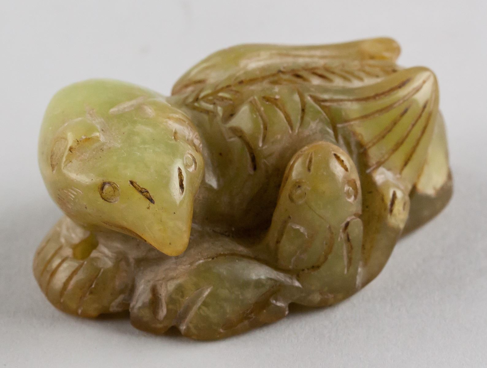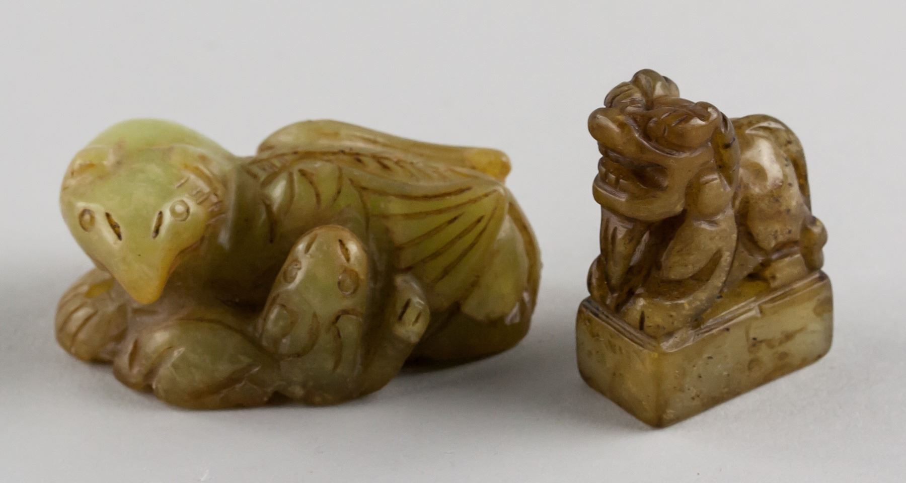 Two (2) assorted Chinese green hardstone carved statues. Featuring mythical beast form. 2 x 6 cm, 128 grams total