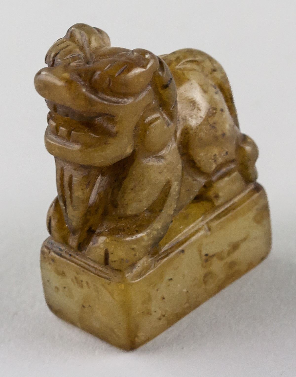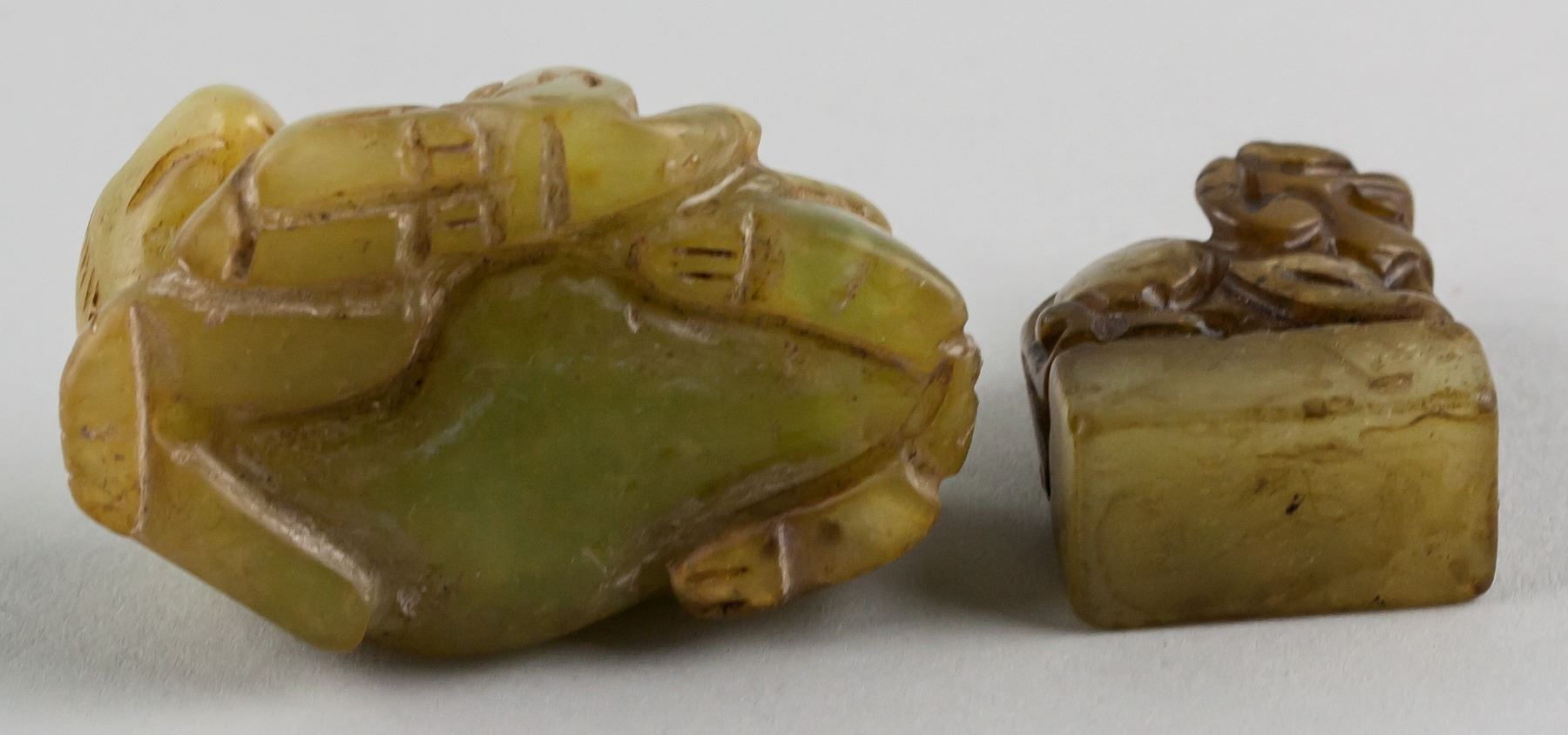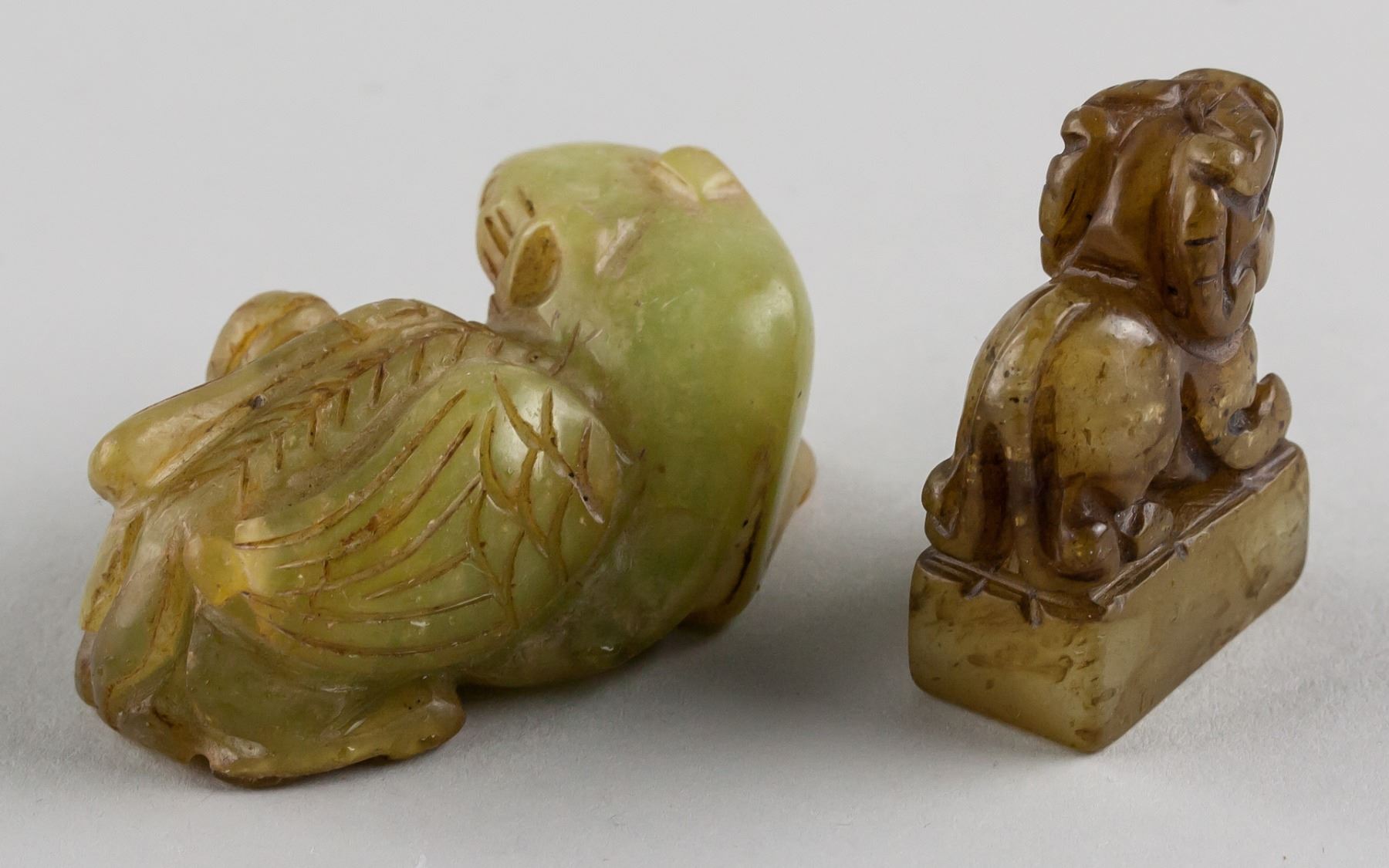 Two (2) assorted Chinese green hardstone carved statues. Featuring mythical beast form. 2 x 6 cm, 128 grams total
