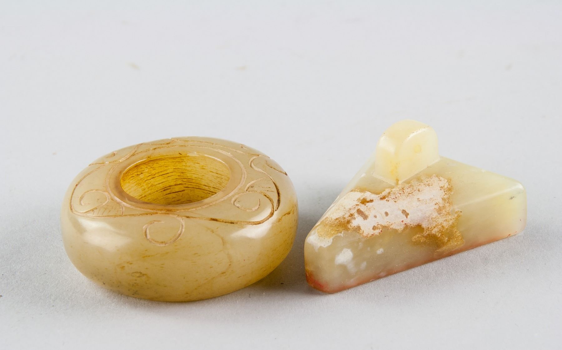 Chinese white Shoushan stone carved items. One triangle form seal with Chinese characters in seal script; of one round water pot with carving decoration; 4.5 cm, 102 grams