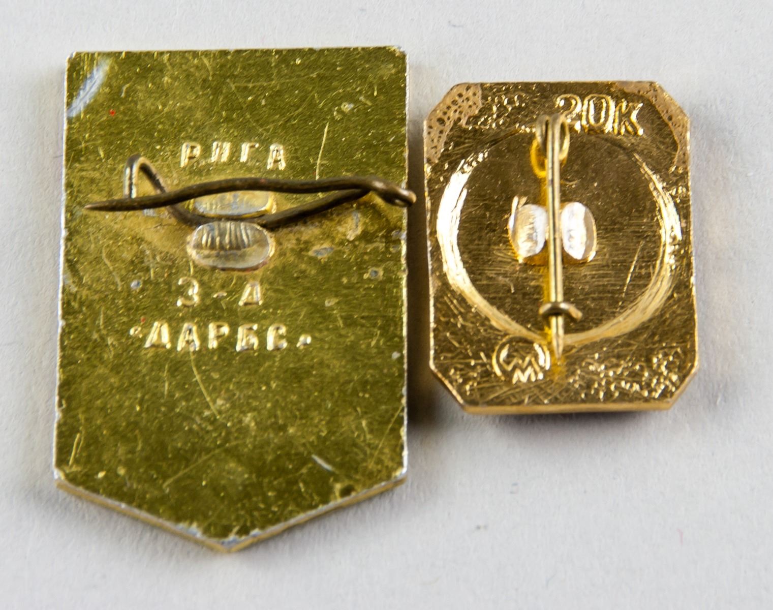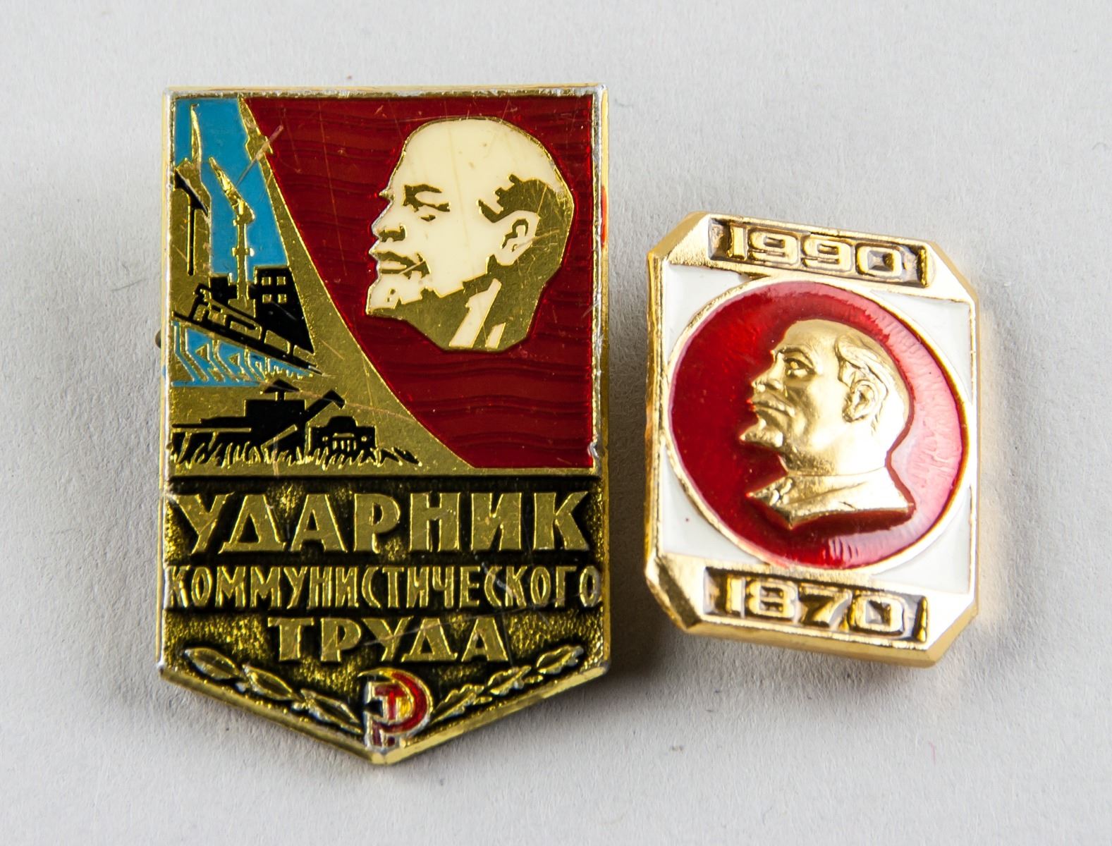 Two (2) assorted Soviet Union Vladimir Lenin pins, one Record-Setter in Communist Labour" Award pin, one political Lenin komsomol Russia international 1870 - 1990 pin, 3 x 2 cm, 5 grams