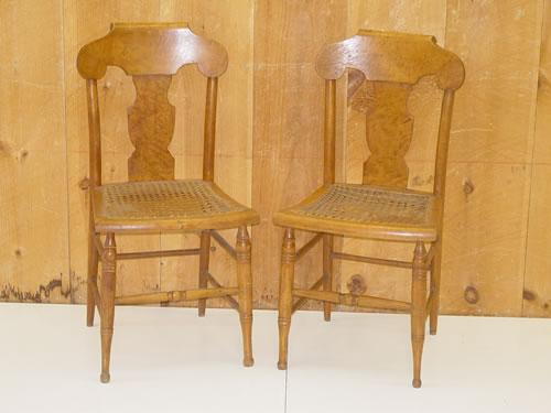 (2) BIRDSEYE MAPLE EMPIRE SIDE CHAIRS W/ TURNED LEGS & STRETCHERS, SHAPED SCROLLED CRESTS, VASE FORM SPLATS & CANED SEATS (34 1/2" T X 17 1/2" W X 16 1/2" D) - WEAR, SEAT DAMAGE, IMPERFECTIONS;