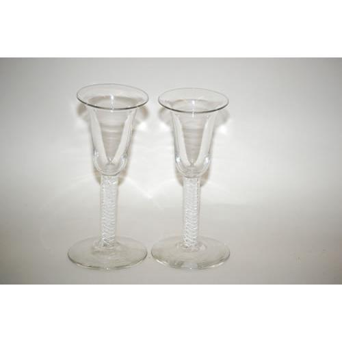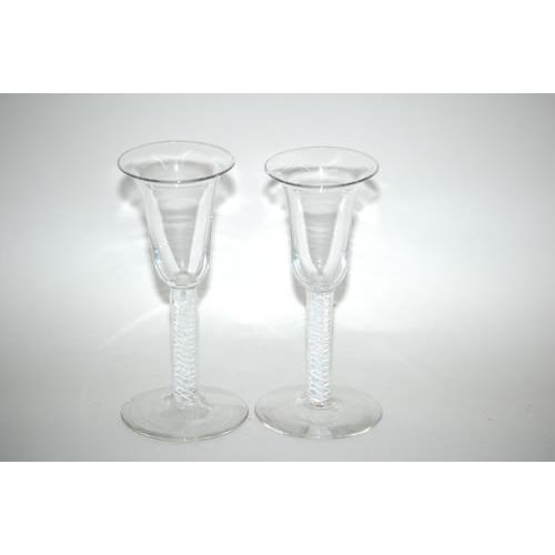 (2) BLOWN AIR TWIST STEMMED WINES - PR. TALL BLOWN GLASS WINE GLASSES W/ FLARED BOWL RIMS, ROUND PONTILED BASES & WHITE AIR TWIST STEMS (5 7/8" T X 2 3/4" W) - WEAR, IMPERFECTIONS