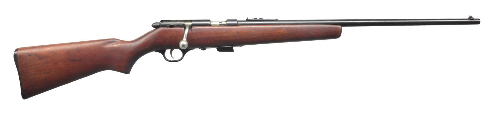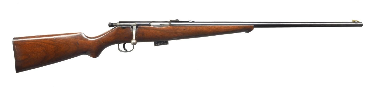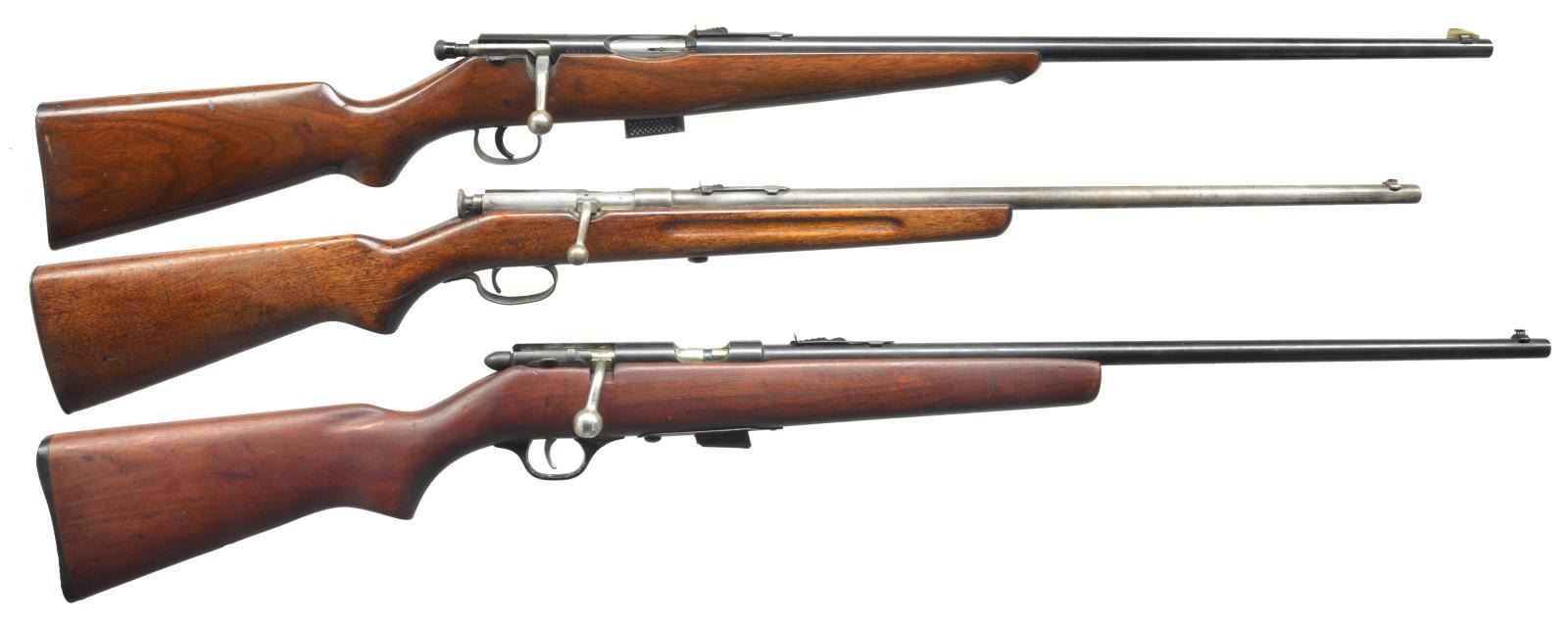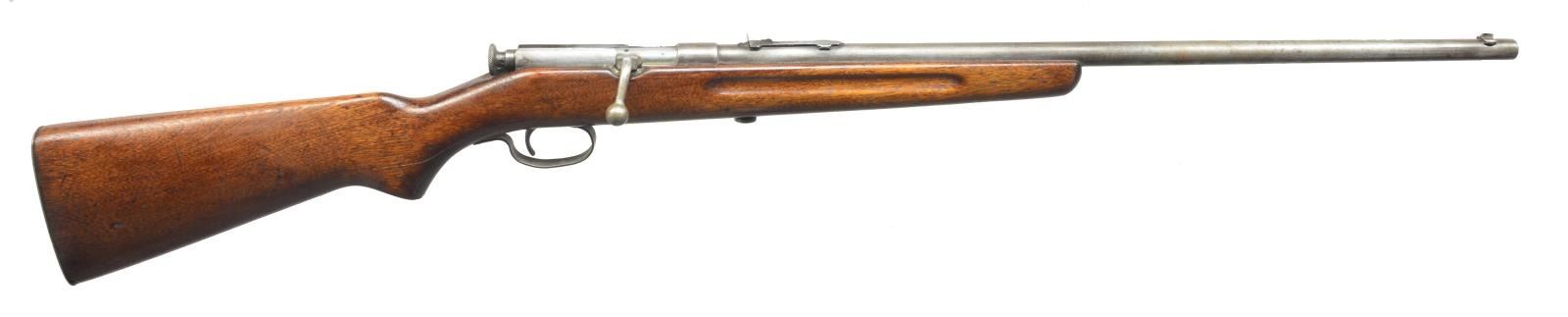 1) SAVAGE MODEL 23B SPORTER. Cal. 25-20. S# 52862. Bbl. 24" w/ integral bolt action as Savage marked U notch rear sight & German silver blade front. Fitted w/ 5 rd. mag. American walnut pistol grip stock w/ schnabled tip & savage marked steel buttplate. CONDITION: good as refinished. All metal parts reblued. Bolt body repolished. Stock w/ most of old oil refinish. Bright shiny bore. Mechanically good. (20-3564/MGM). 2) MARLIN MODEL 80. Cal. 22 S, L, LR. NSN. Bbl. 24" bbl. w/ U notch adj. rear sight & silver bead front sight. Bolt action w/ grooved top for scope. Safety at right rear. Pistol grip American walnut stock w/ Marlin buttplate. MAGS: 5 rd. mag. CONDITION: very good. Metal parts w/ over 90% original blue w/ considerable scattered light rusting. Bolt w/ stains on polished body. Stock retains over 90% original oil finish. Bright shiny bore. Mechanically good but action stiff, needs lubrication. (20-3603/MGM.) 3) SINGLE SHOT PEERLESS MARKED 22. Cal. 22 S, L, LR. NSN. Bbl. 24" bbl. w/ adj. rear sight & bead front. Most likely made by Stevens. Left rear of action is marked “PEERLESS”. Action & bbl. are removable from stock w/ screw through bottom. American walnut. Pistol grip stock has steel buttplate & finger grooves on forend. CONDITION: poor to fair, metal parts cleaned to gray over considerable scattered pitting. Stock w/ oil rubbed on. Bore lightly pitted. Mechanically good. (20-3613/MGM). ALL CURIO. $250-400.