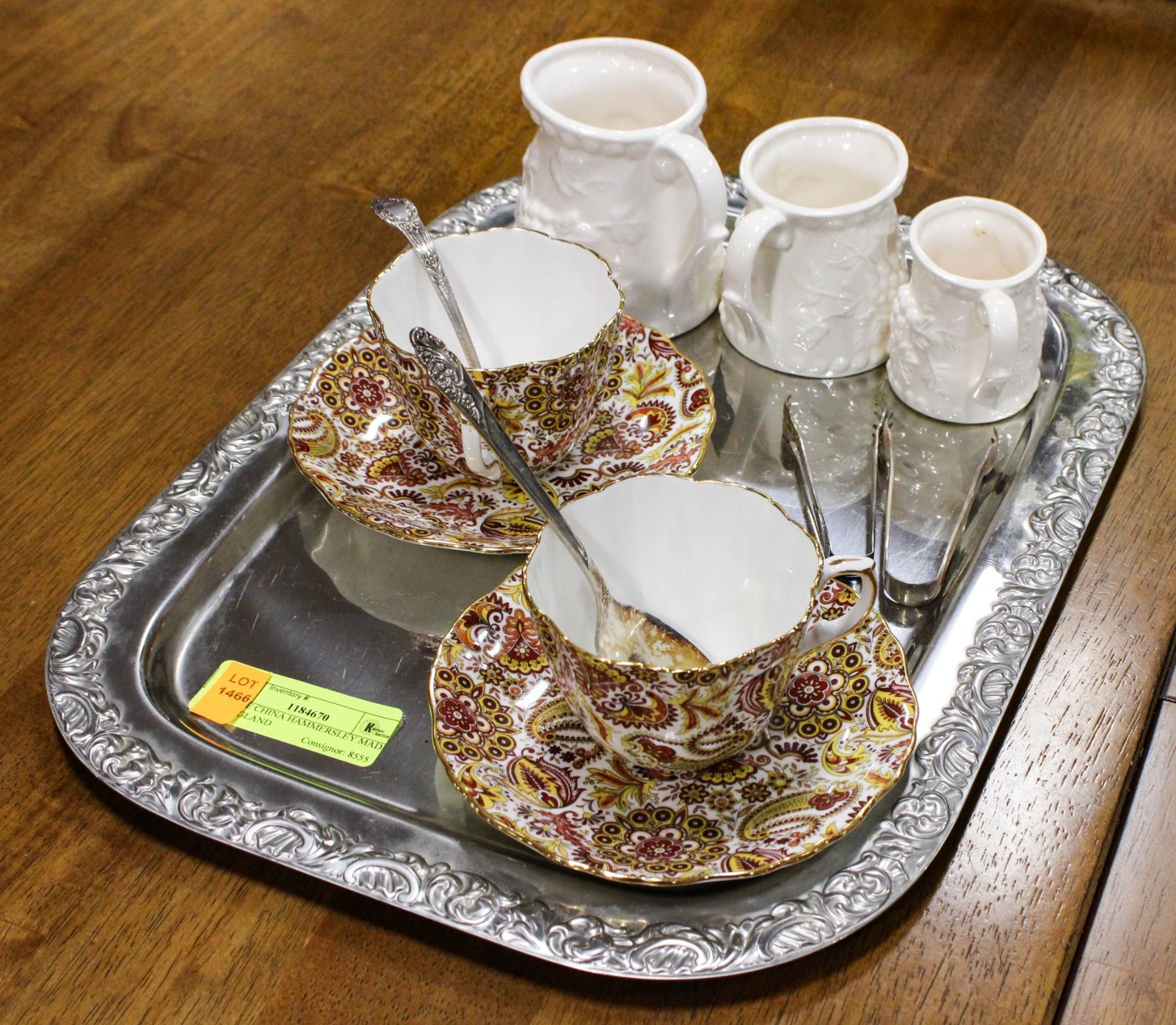 TEA CUPS WITH SAUCERS + 3 OLD PORCELAIN MEASURING CUPS 1 CUP, 1/2 CUP & 1/4 CUP WITH SILVER PLATED CUTLERY ON A SILVER PLATED ESTATE TEA TRAY **ALL ITEMS MUST BE REMOVED BY 5PM SATURDAY, MARCH 8TH 2025. ALL REMAINING ITEMS WILL BE SUBJECT TO A $6.00 PER DAY STORAGE CHARGE. ANY ITEMS REMAINING AFTER MONDAY, MARCH 24TH 2025 WILL BE CONSIDERED FORFEITED. NO REFUNDS WILL BE ISSUED FOR FORFEITED ITEMS. TO SCHEDULE A PICK UP APPOINTMENT CLICK HERE