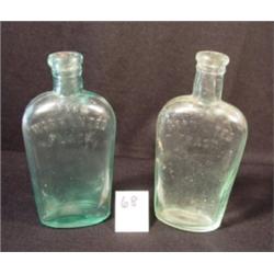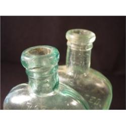 2 Bottles marked "Warranted Flask" left aqua blue & right blue (vaseline?) L marked 7 oz slight size variation L (6 3/8" by 3" by 1 1/2") and R (6 1/2" by 3" by 1 1/2"). R has longer and narrower neck, seamed w/applied tops, embossed letter, foggy glass.