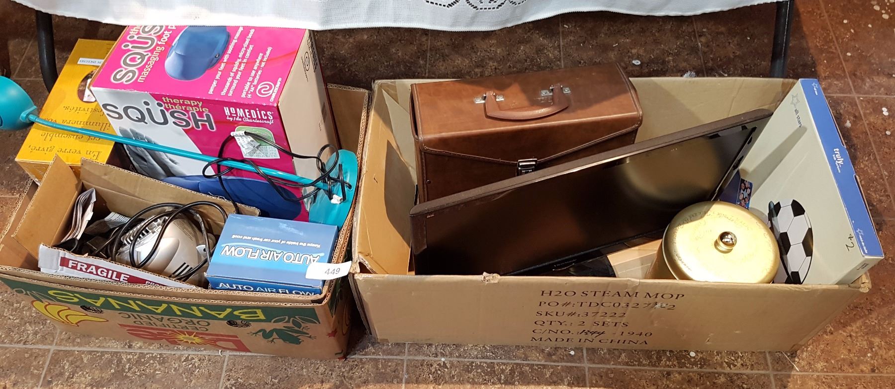 2 BOX LOTS OF NEW HOUSEHOLD ITEMS INC. MASSAGING FOOT PILLOW, AUTO AIR FLOW UNIT, ETC.