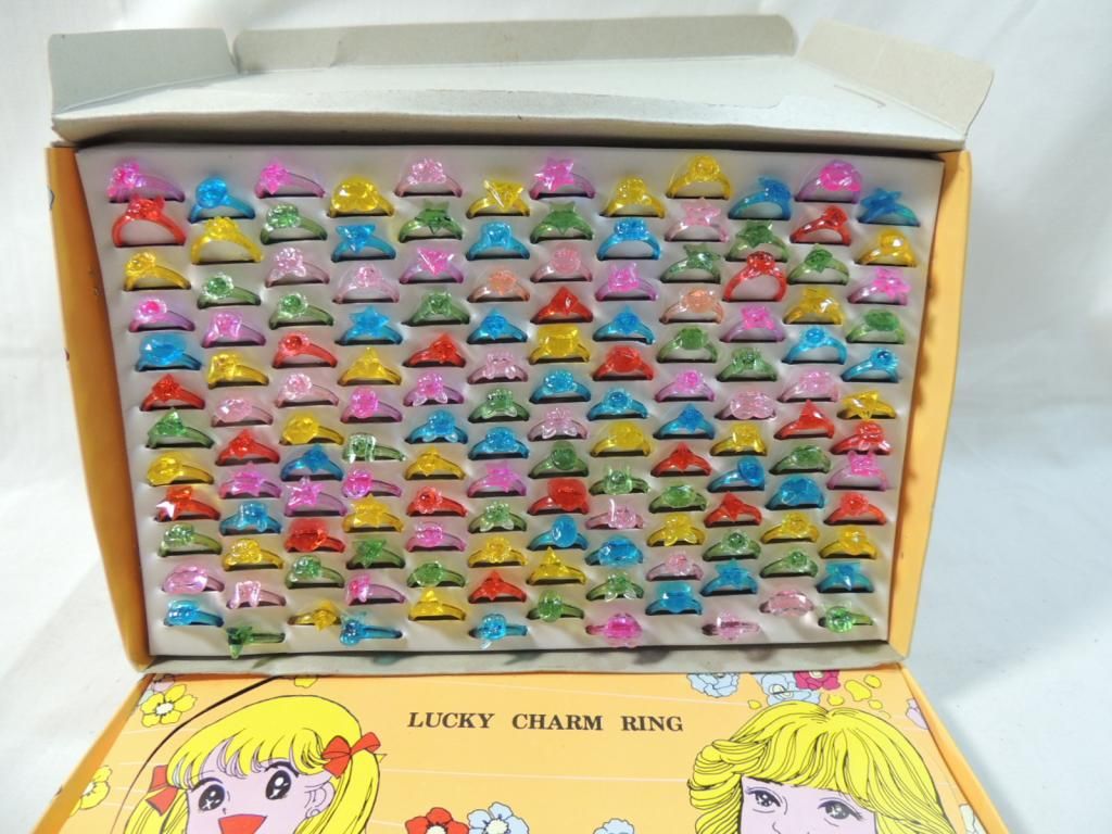 2 BOX LUCKY CHARM RING SETS, LUCKY CHARM RING SET. SMALL PLASTIC RINGS AS SHOWN. SEE PHOTO FOR MORE DETAILS.