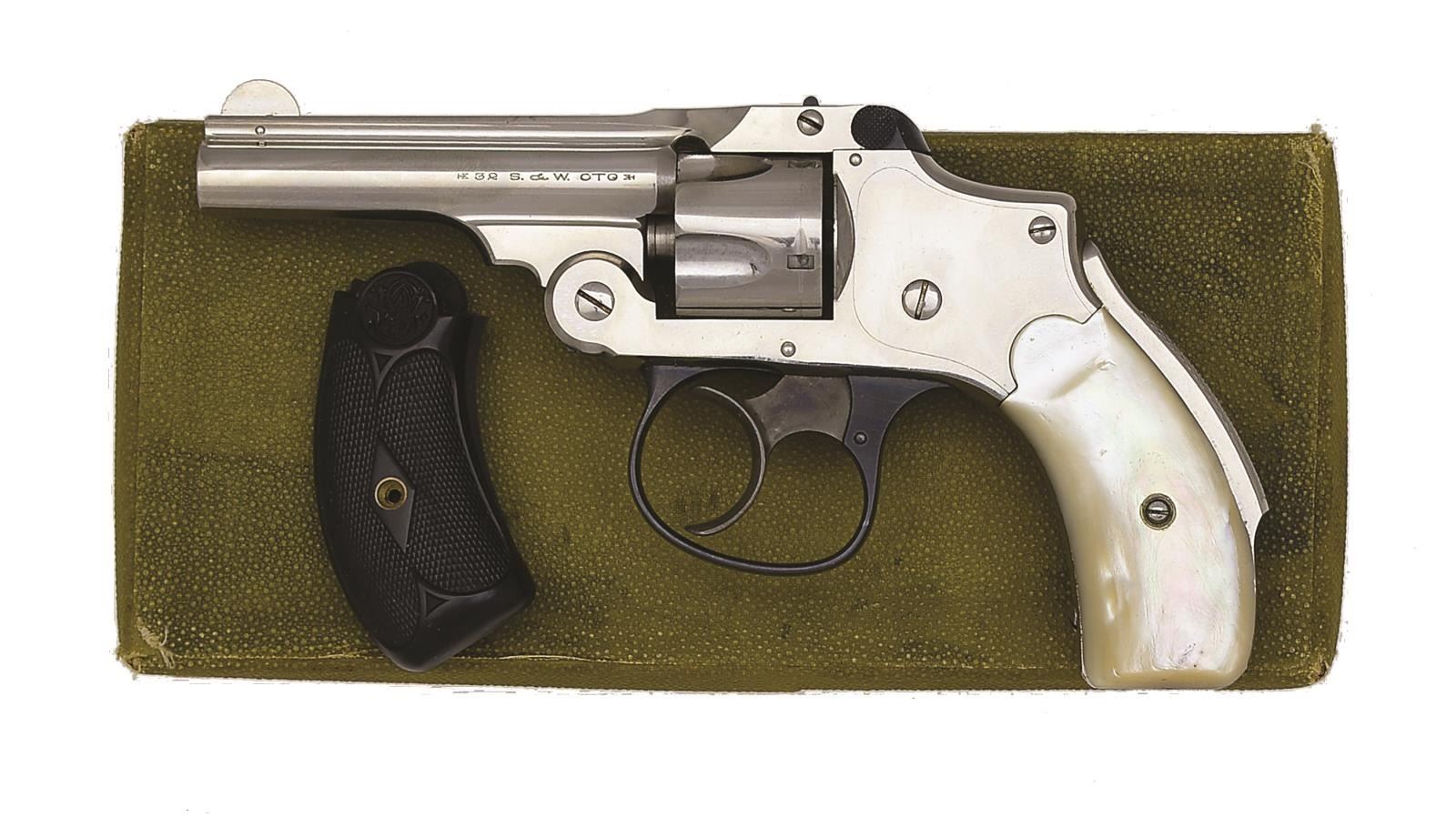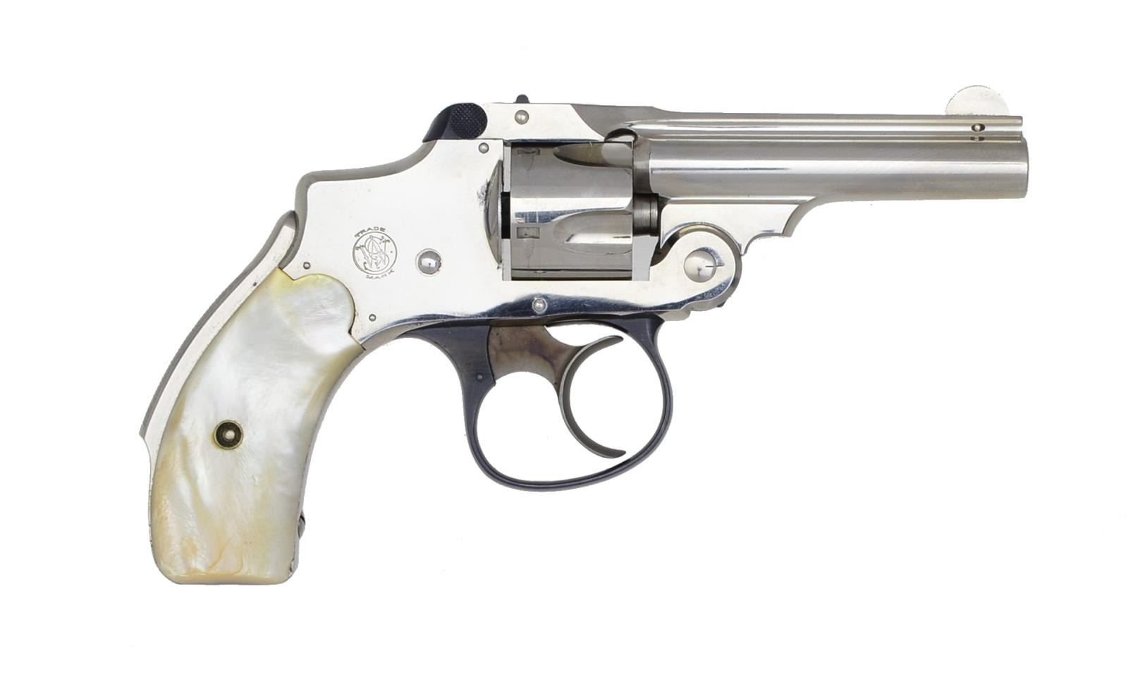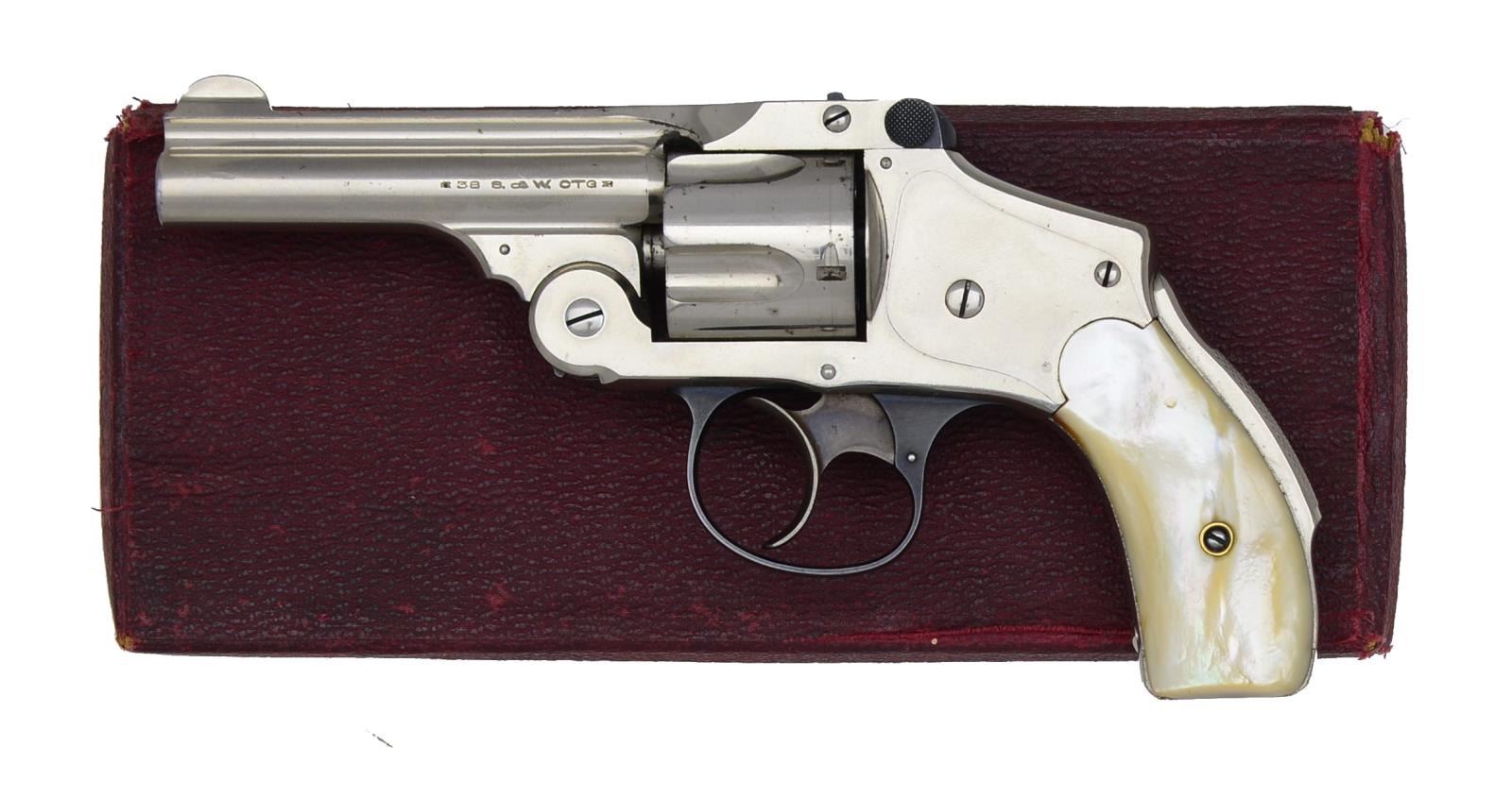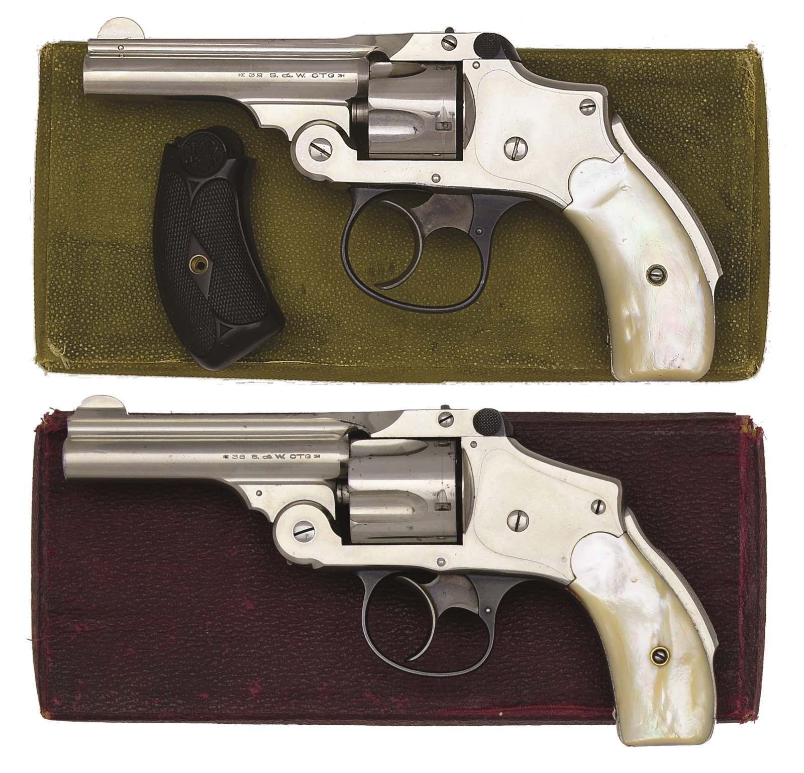 REVOLVERS. 1) 32 SECOND MODEL. Cal. 32 S&W. S# 110032. Bbl. 3" w/ rib & pinned semicircular blade front sight. 5 Shot fluted cyl. Nickel finished top break hammerless action w/ grip safety. Blued trigger guard w/ case colored hammer. 2 Piece pearl grips. UNATTACHED ACCESSORIES: 1 piece gold box containing original hard rubber grips & cleaning brush. CONDITION: over 98% metal finish. Very good grips. Smooth mechanics. Bright near excellent bore. (20-3846/DS). 2) 38 FIFTH MODEL. Cal. 38 S&W. S# 240114. Bbl. 3 1/4" w/ rib & semicircular sight. 5 Shot fluted cyl. Nickel finished top break hammerless action w/ grip safety. Blued trigger guard w/ case colored hammer. 2 Piece pearl grips. UNATTACHED ACCESSORIES: 1 piece red box. CONDITION: over 90% nickel finish showing light scratches & spots of corrosion. Grips have sm. age related cracking. Bore retains strong rifling showing scattered sm. spots of pitting. (20-3850/DS). ALL CURIO. $900-1,500.