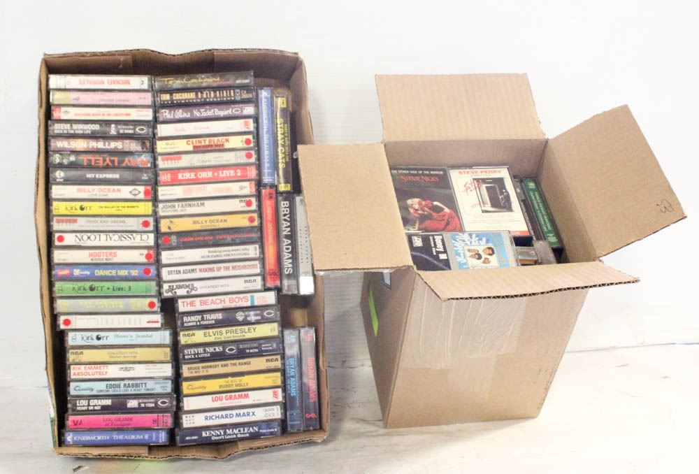 2 BOXES FULL OF 106 CASSETTE TAPES