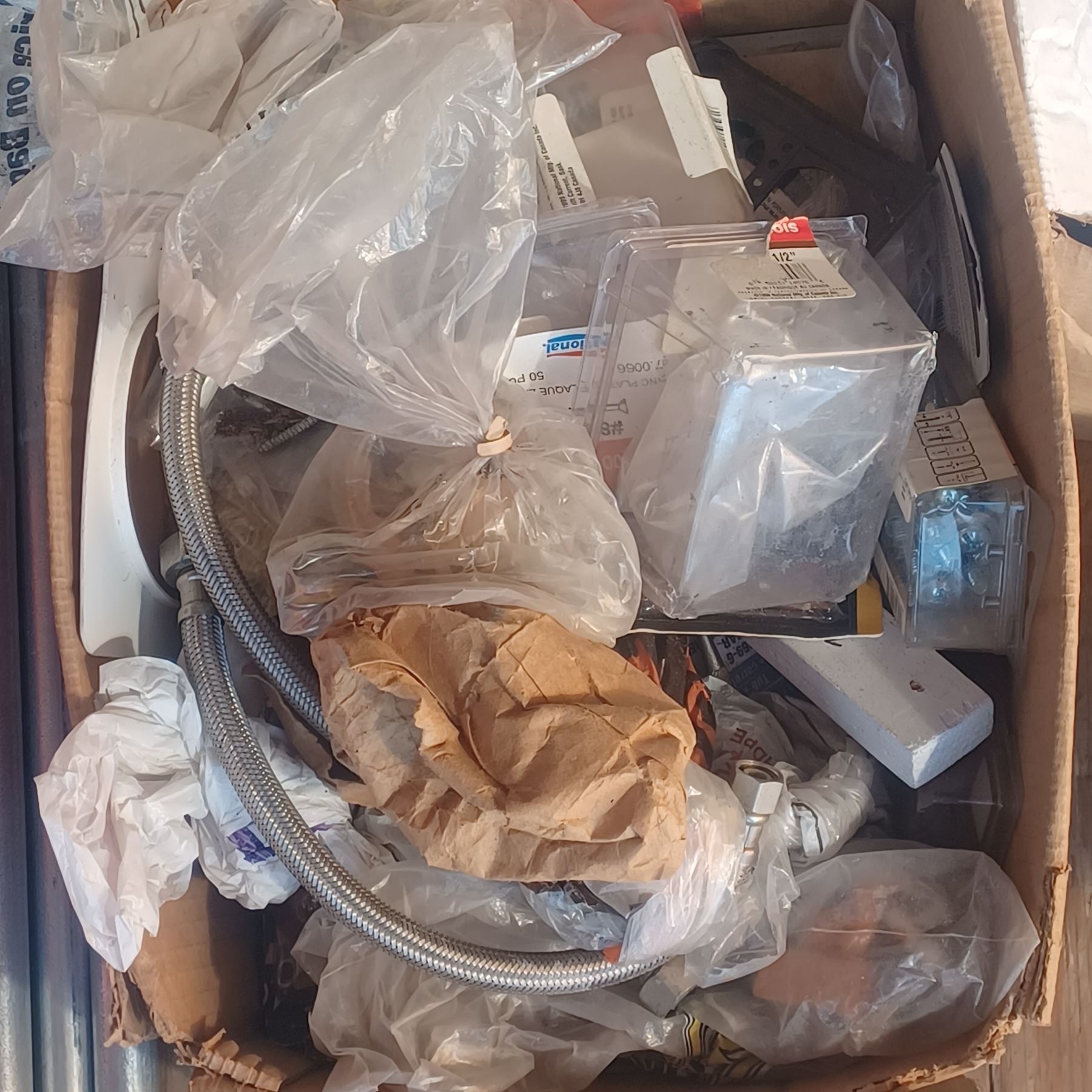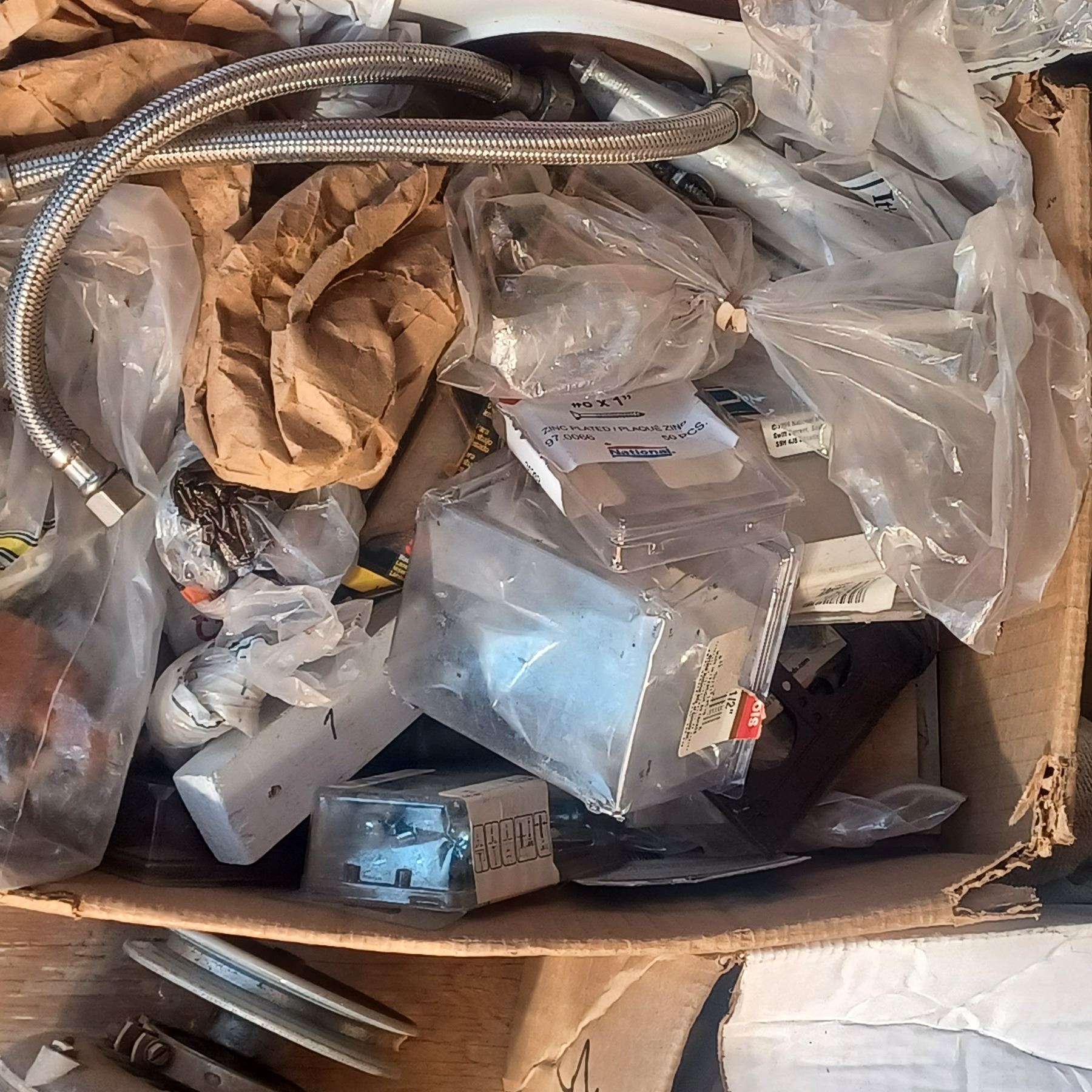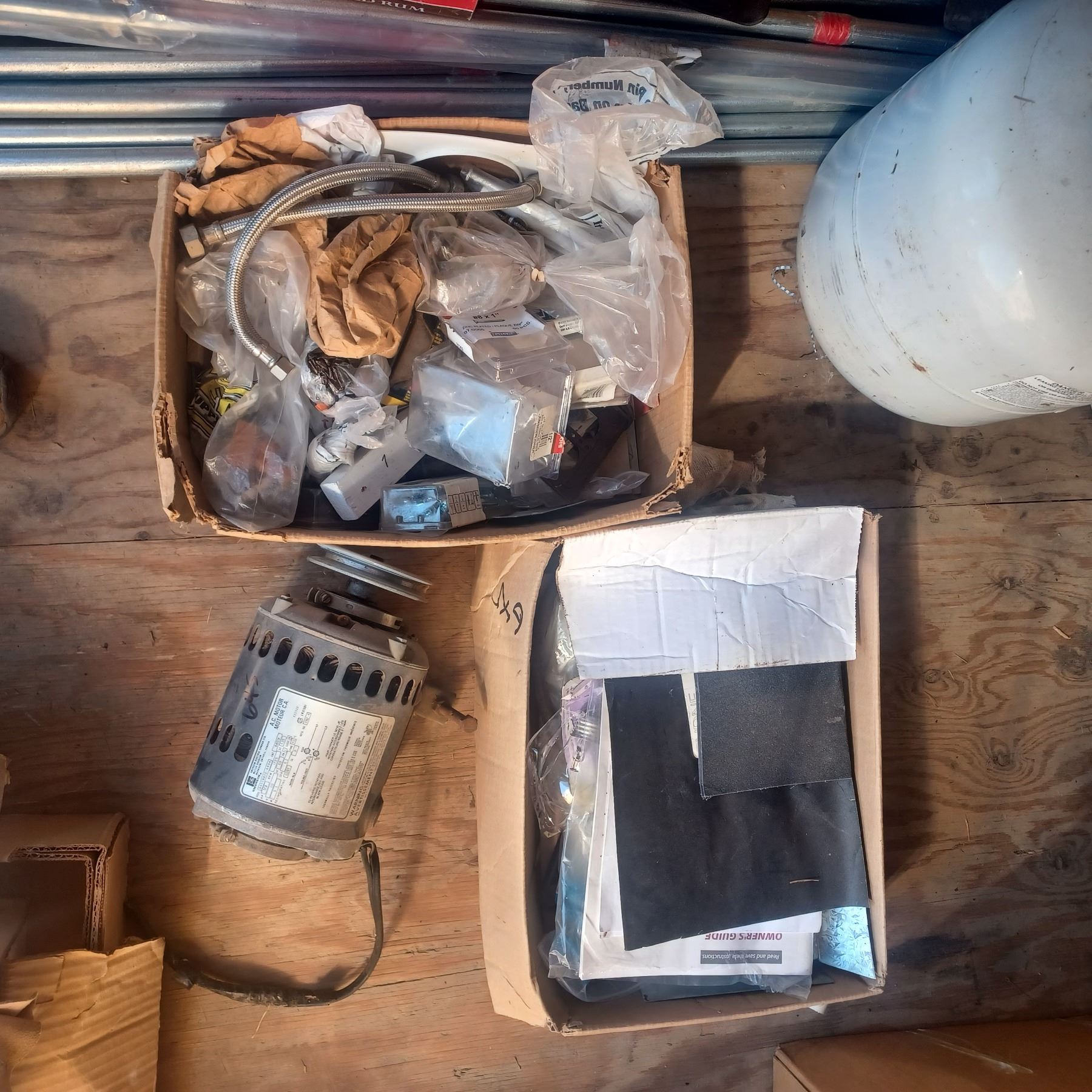 2 BOXES OF ASSORTED HARDWARE AND 1/3 HP MOTOR