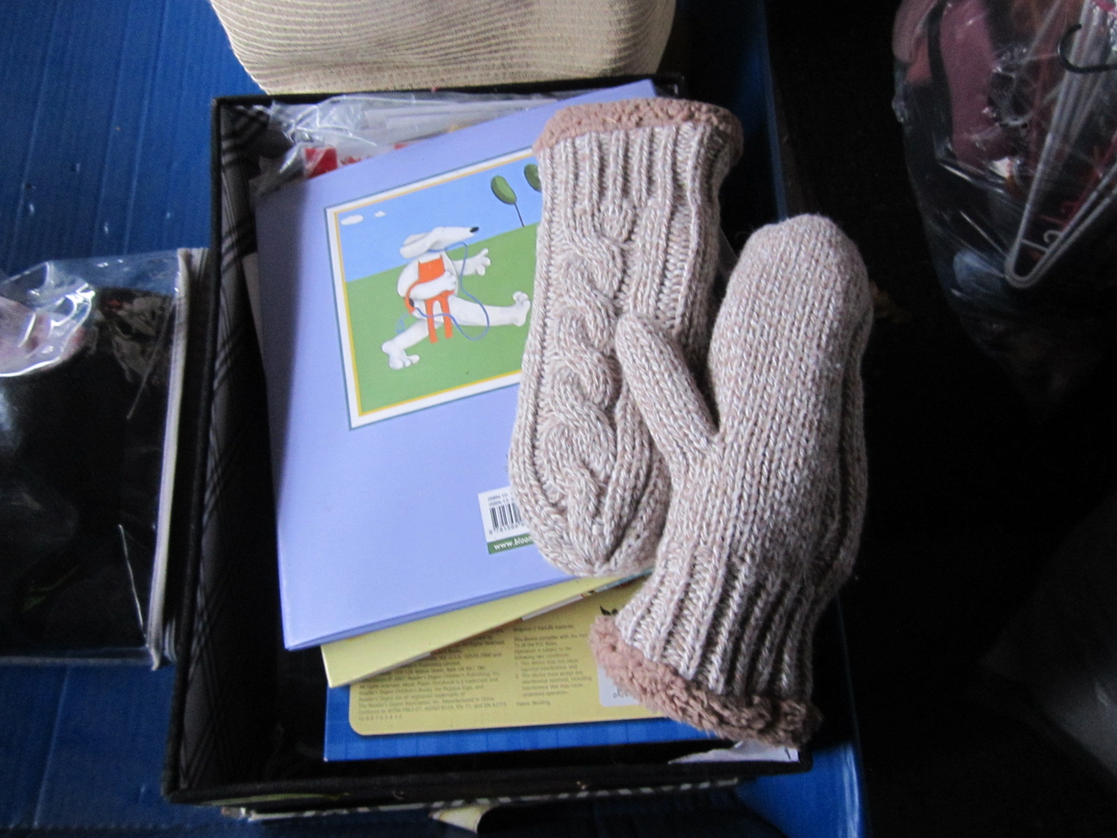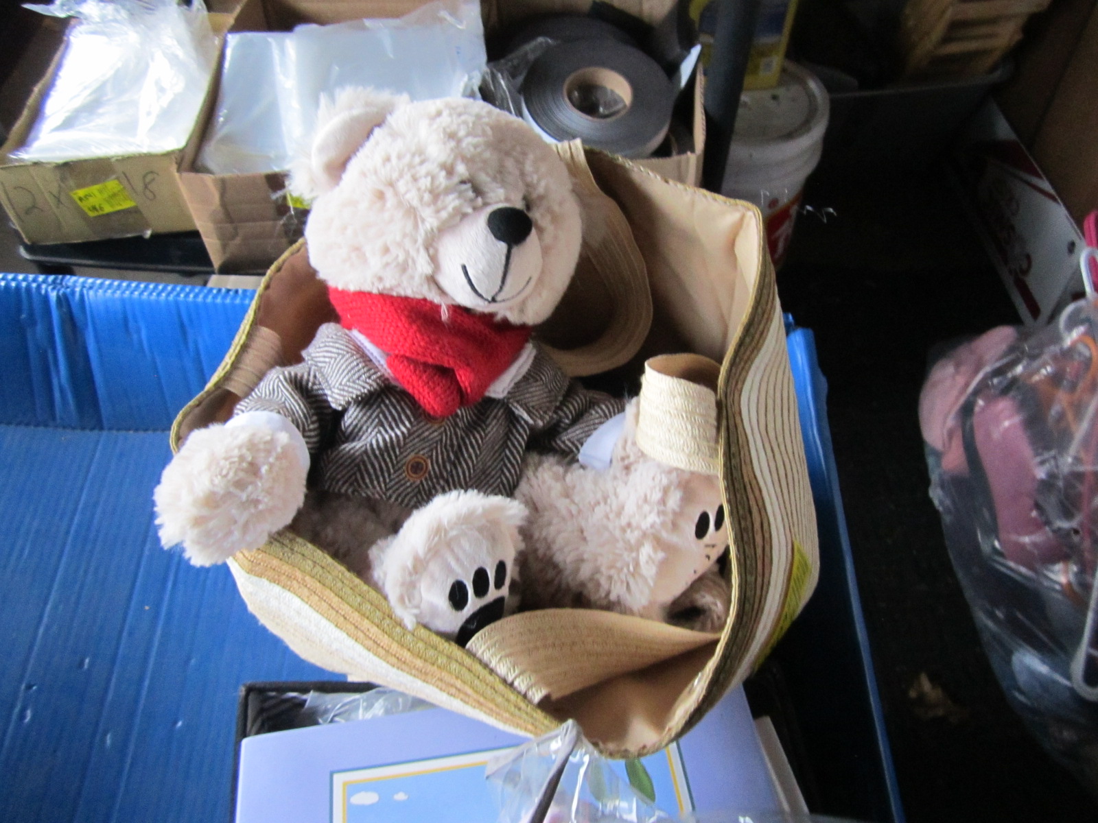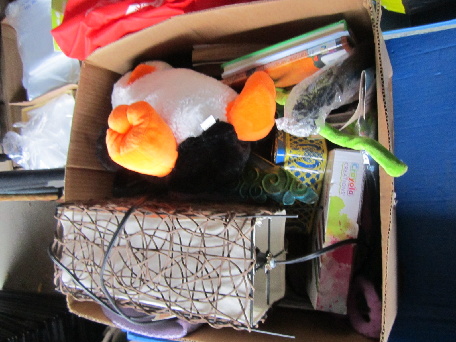 2 BOXES OF MISC. SHOES, BOOKS, LAMP, STUFFED ANIMAL, ETC.