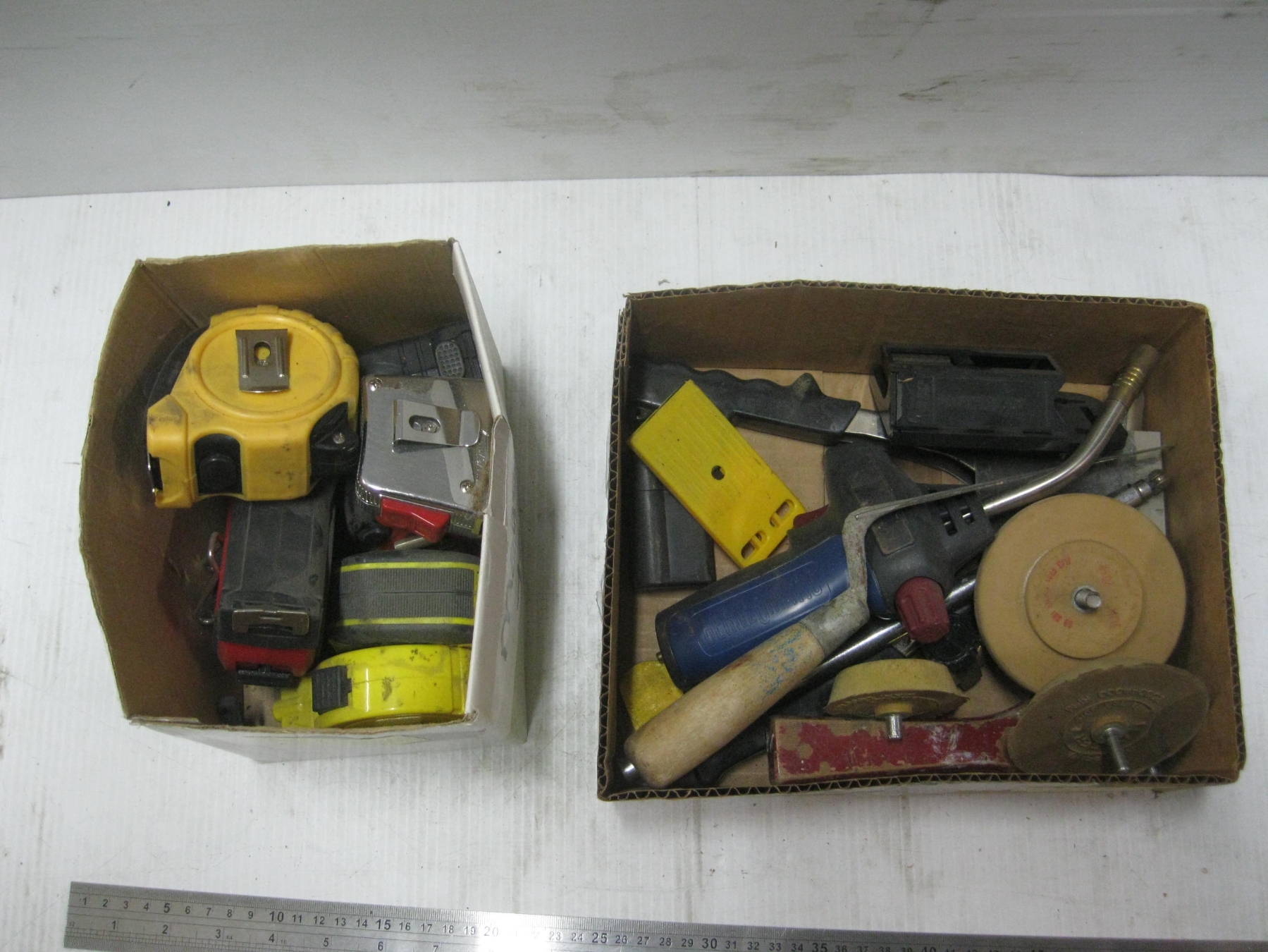2 BOXES OF MISC. TOOLS, TORCH HEAD TAPE MEASURES, ETC.