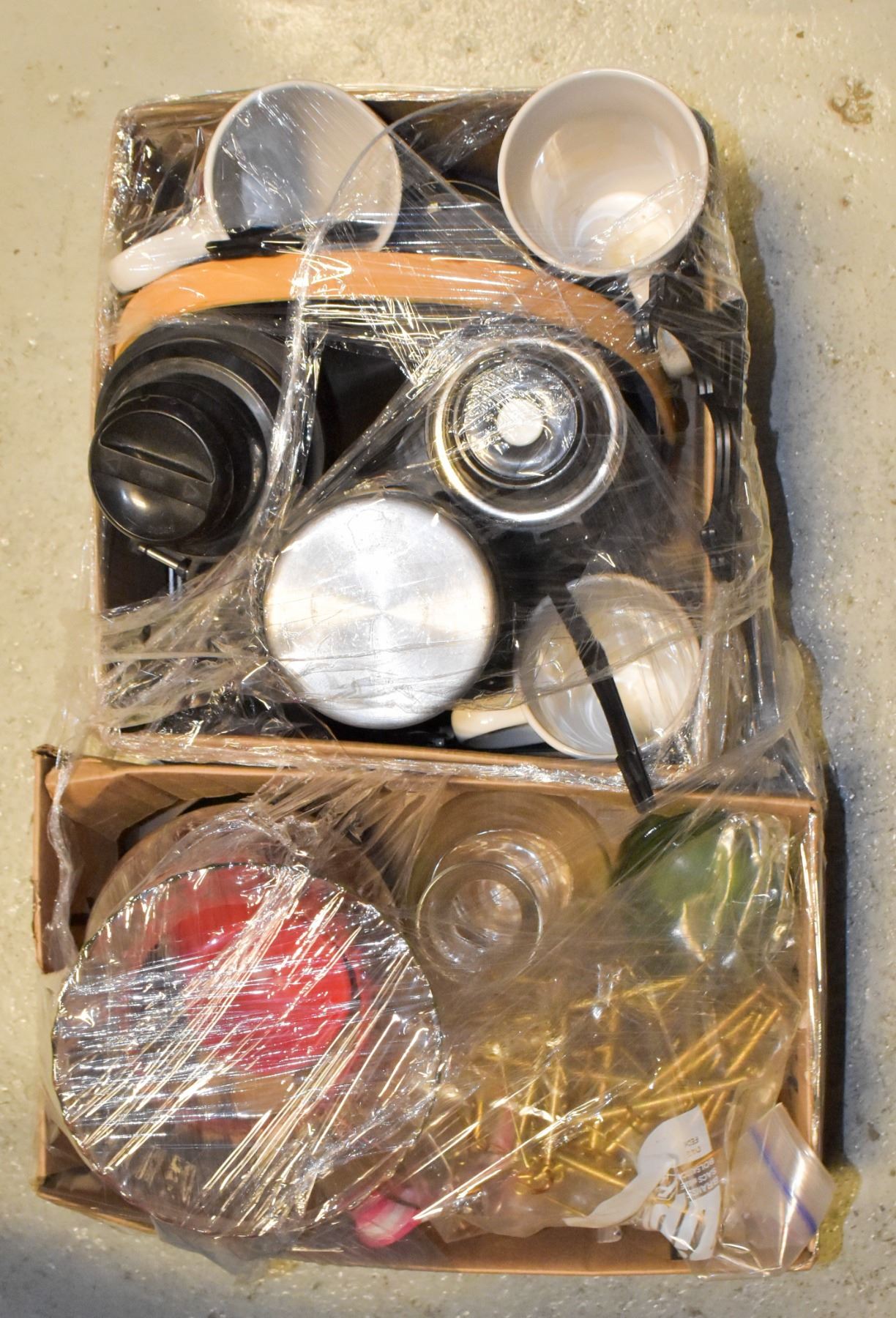 2 BOXES OF MUGS, GLASS VASES, PLATE HANGERS & MORE
