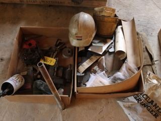 2 BOXES WITH HARD HATS, TOOLS, SAND PAPER