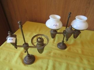 2 BRASS DESK OIL LAMPS WITH 2 MILK GLASS SHADES