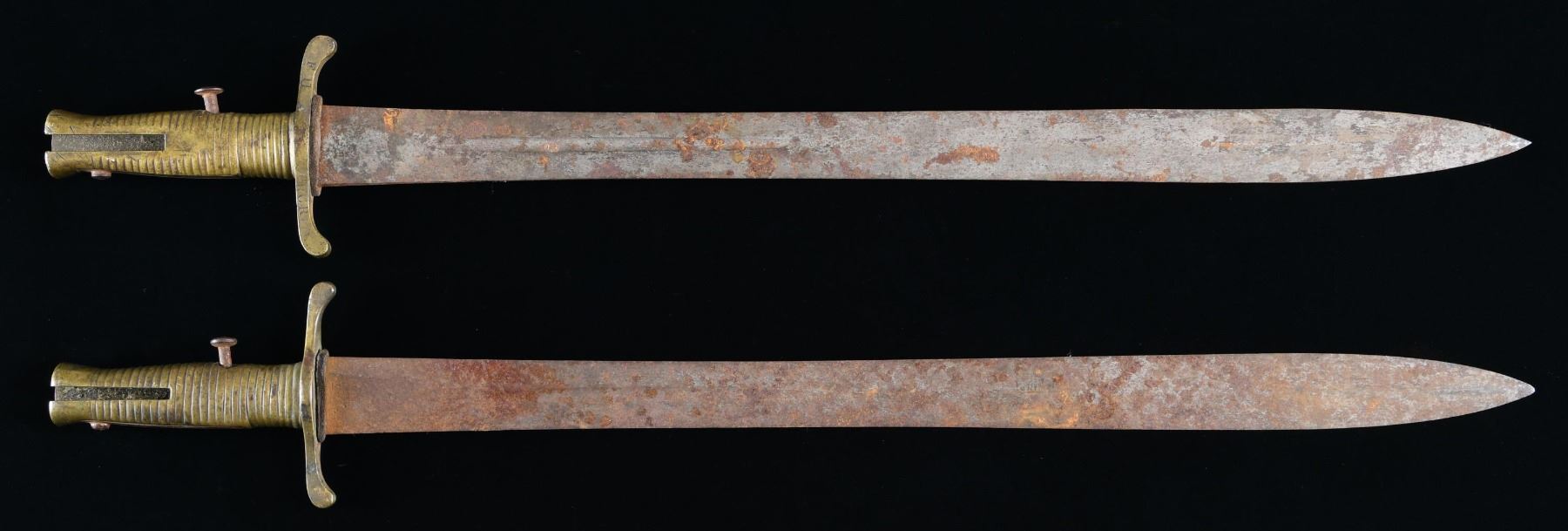 1) Overall length: 26 5/8". Blade length: 21 3/4". Plain blade with a narrow fuller that extends 8 1/2" up the blade. Blade is marked near the hilt "(crown)" over "VR ENFIELD 1840" and "(crown)" over "V" over "6". Brass hilt with a simple crossguard having dual downturned quillions. The crossguard is stamped "F11" & "RCR" for Royal Canadian Regiment. Brass horizontally reeded grip with iron spring and button. No scabbard. CONDITION: blade is universally rusted and hilt shows a pleasing dark patina. 2) Overall length: 26 1/4". Blade length: 21 1/2". Plain blade with a narrow fuller that extends 8 1/2" up the blade. Blade is marked near the hilt "(crown)" over "VR ENFIELD 1839" and marks on the other side are obscured by oxidation. Brass hilt with a simple crossguard having dual downturned quillions. Brass horizontally reeded grip with iron spring and button. The pommel is engraved "5 Co. 86". No scabbard. CONDITION: blade is heavily rusted; however, the hilt shows a pleasing dark patina. (02-23837/BF) $500-800.