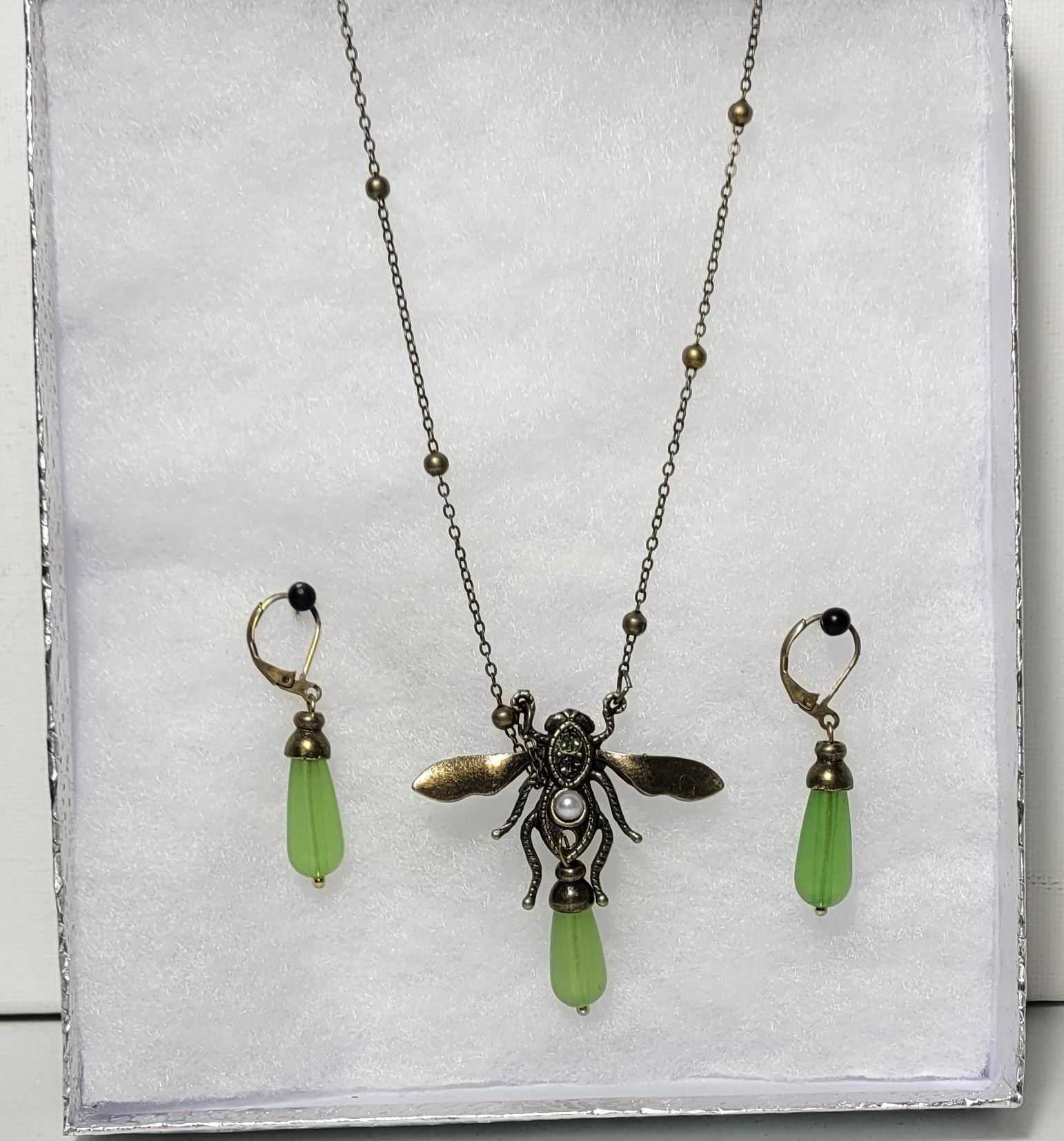 DRAGONFLY PENDANT ON 18" CHAIN WITH 2" EXTENDER AND MATCHING DROP EARRINGS. JEWELERY