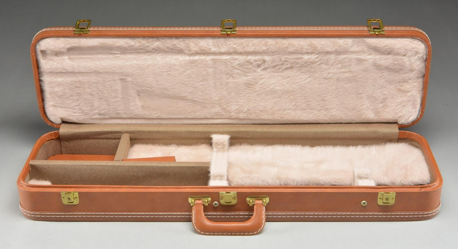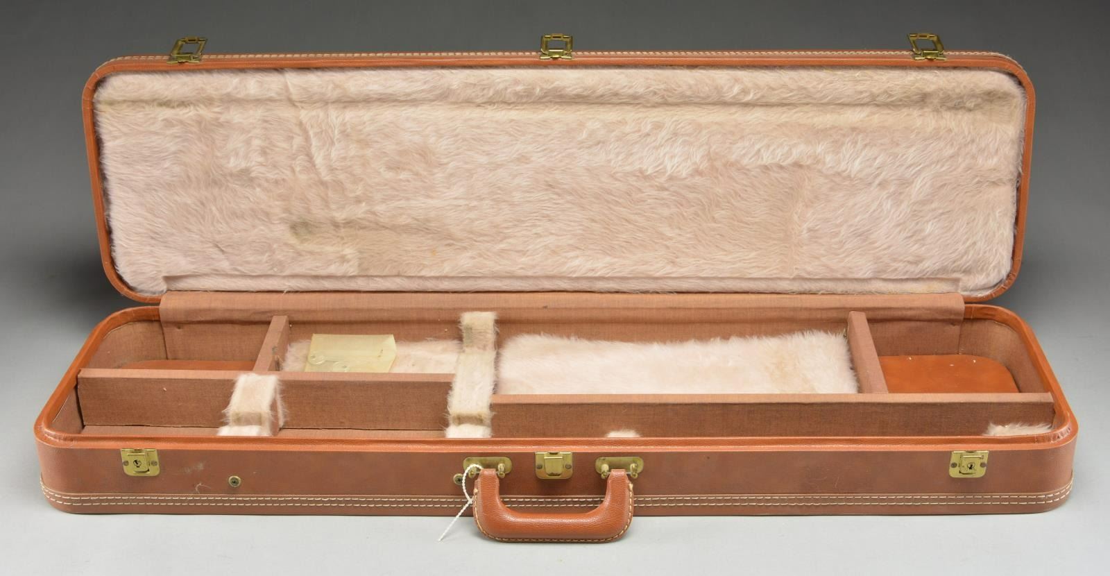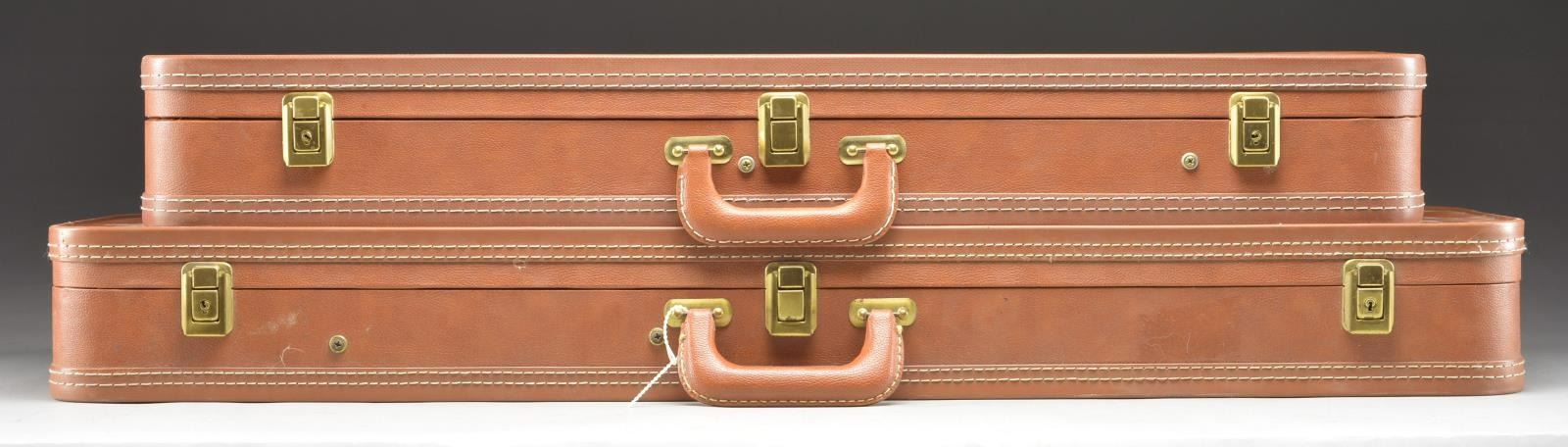 1) 32" X 10" X 5" Brown leather luggage case w/ felt interior appearing for Superposed style shotguns. Able to fit 30" bbls. 2) 37" X 11" X 5" Brown leather luggage case w/ felt interior appearing for Superposed style shotguns. Able to fit 32" bbls. CONDITION: both cases appear in good to very good condition w/ light wear. (02-19742-1/MD). $300-500.
