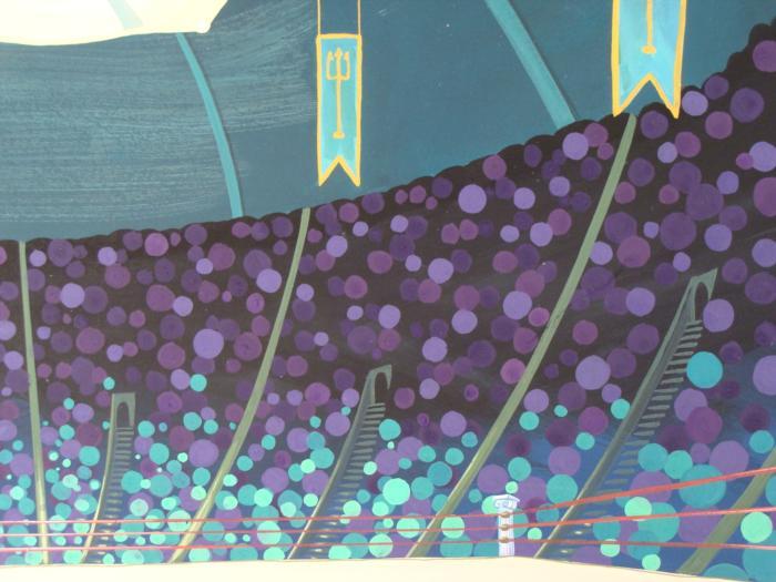 These original hand-painted backgrounds are from the Nickelodeon TV show SpongeBob Squarepants. The story takes place under the deep blue sea in Bikini Bottom, where SpongeBob resides. SpongeBob, who is a yellow, porous sponge, is your typical happy-go-lucky character, as he is always cheerful and enjoys making people laugh. Patrick Star, SpongeBob's neighbor who is a starfish, is your average children's show idiot, as he boasts knowing nothing and is often getting himself into ridiculous situations. Between the homes of these two lies the home of the miserable Squidward, a squid, who is known for being grouchy and playing tricks on SpongeBob and Patrick. Both SpongeBob and Squidward work at the Krusty Krab, a fast food business run by the greedy money-loving Mr. Krabs, a crab, the arch rival of the evil, possibly misunderstood, Plankton. Another neighbor, Sandy Cheeks, an athletic squirrel who normally wears an astronaut's space suit, was introduced in "Tea at the Treedome." She spends most of her time inventing and experimenting. It looks like a possible "throw-down" is going to occur in these backgrounds; all bets are off.Original Production Background Overall Size of Background: 10 1/2" x 22 1/2" and 13 1/2" x 17 1/4" Very good condition; it has been stored rolledOriginal Production Backgrounds are used in the making of the final version of animated productions. The background establishes the location and the overall good mood of the scenee. Typically, a background layout artist creates a drawing to establish the content of the scene, placement of characters, perspective and camera angle. Based on this drawing, the background artist creates a preliminary painting to confirm all of the scenes details, then the final production background which is used in the filming of the scene. When these backgrounds are individually photographed behind the progression of production cels, and projected at a rapid succession, the images in the foreground appear to move, creating an animated scene. The background is ready to be matted and framed. It is a colored background with the animator's notations at the bottom.