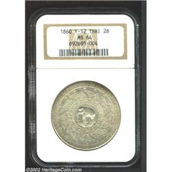 2 Baht ND (1863), Y12, MS64 NGC, a scarcity in Mint State. Important notice: We expect to be auctioning lots at the rate of 200-250 per hour. Sometimes eBay Premier live bid software cannot keep up with that pace, so we strongly recommend that you place a realistic proxy bid now as insurance to avoid disappointment. Also please note that all Heritage/CAA lots purchased through eBay Premier carry a 20% Buyer's Premium. Please make sure you read the Terms and Conditions.
