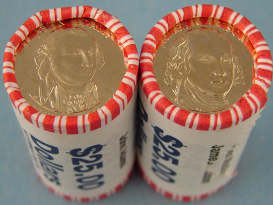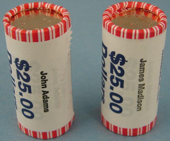 Here are 2 original bank wrapped rolls of 2007 Presidential Dollars- 1 roll of James Madison, and 1 of John Adams. Each roll contains 25 coins, for 50 coins total. All are mint, uncirculated, and unopened.
