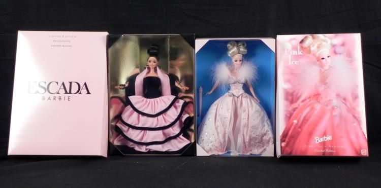 Here are two Barbies from Limited edition sets * Included sets:Pink Ice Princess Barbie DollEscada Barbie Ltd. Edition --- Escada continues to be a premier couture design house although they only created he one small collection of dolls * Detail: Mint in box * We are offering a very large collection of Barbie dolls that have never been opened, which came from an estate in Colorado. This wonderful collection contains hundreds of different dolls, dating back to 1962. This special collection of dolls and accessories were collected as a series and were completed over a period of 20 years. All of the items are in pristine condition and mint in box. We are proud to bring you this collection and sincerely hope that these dolls complete your collection of happiness. *