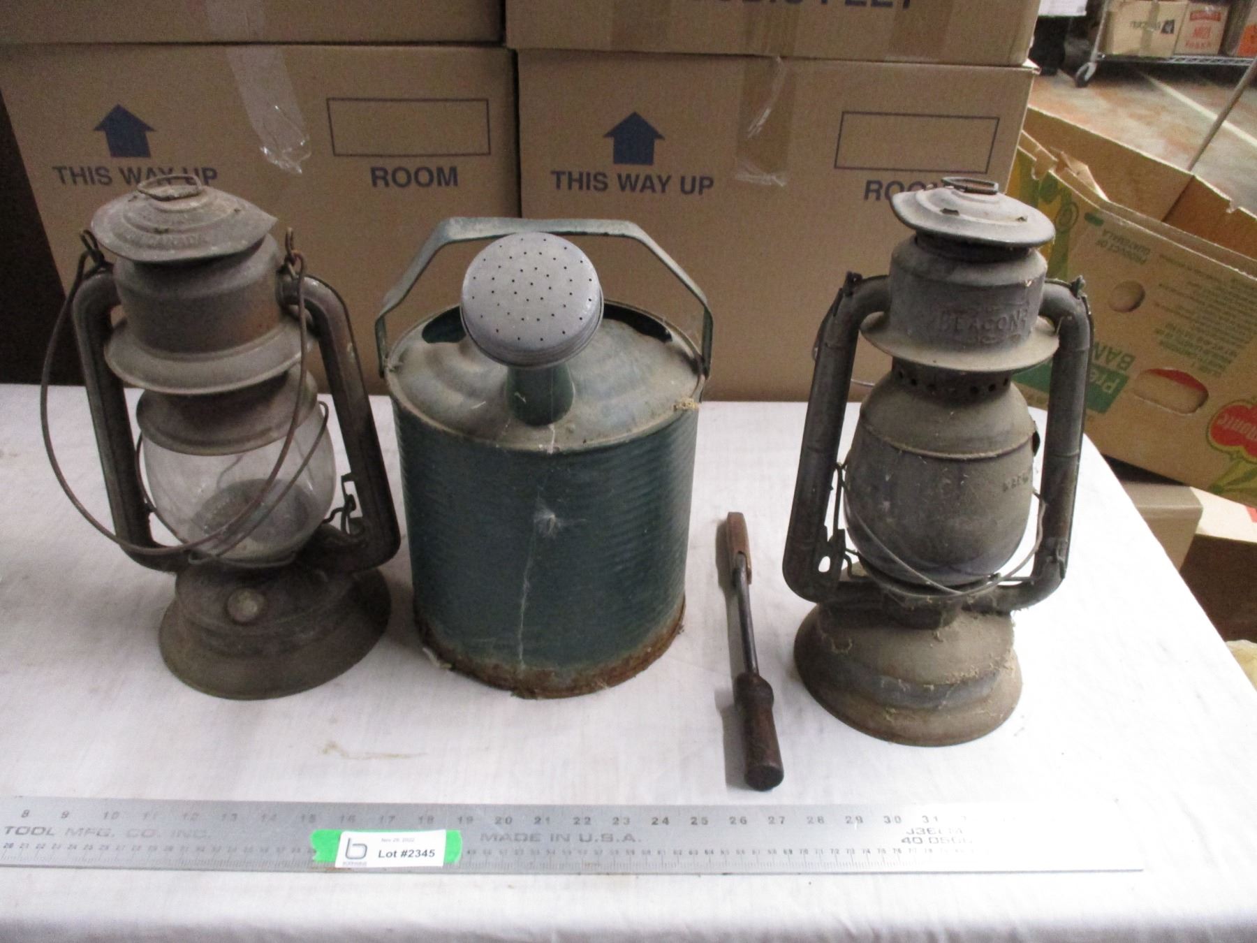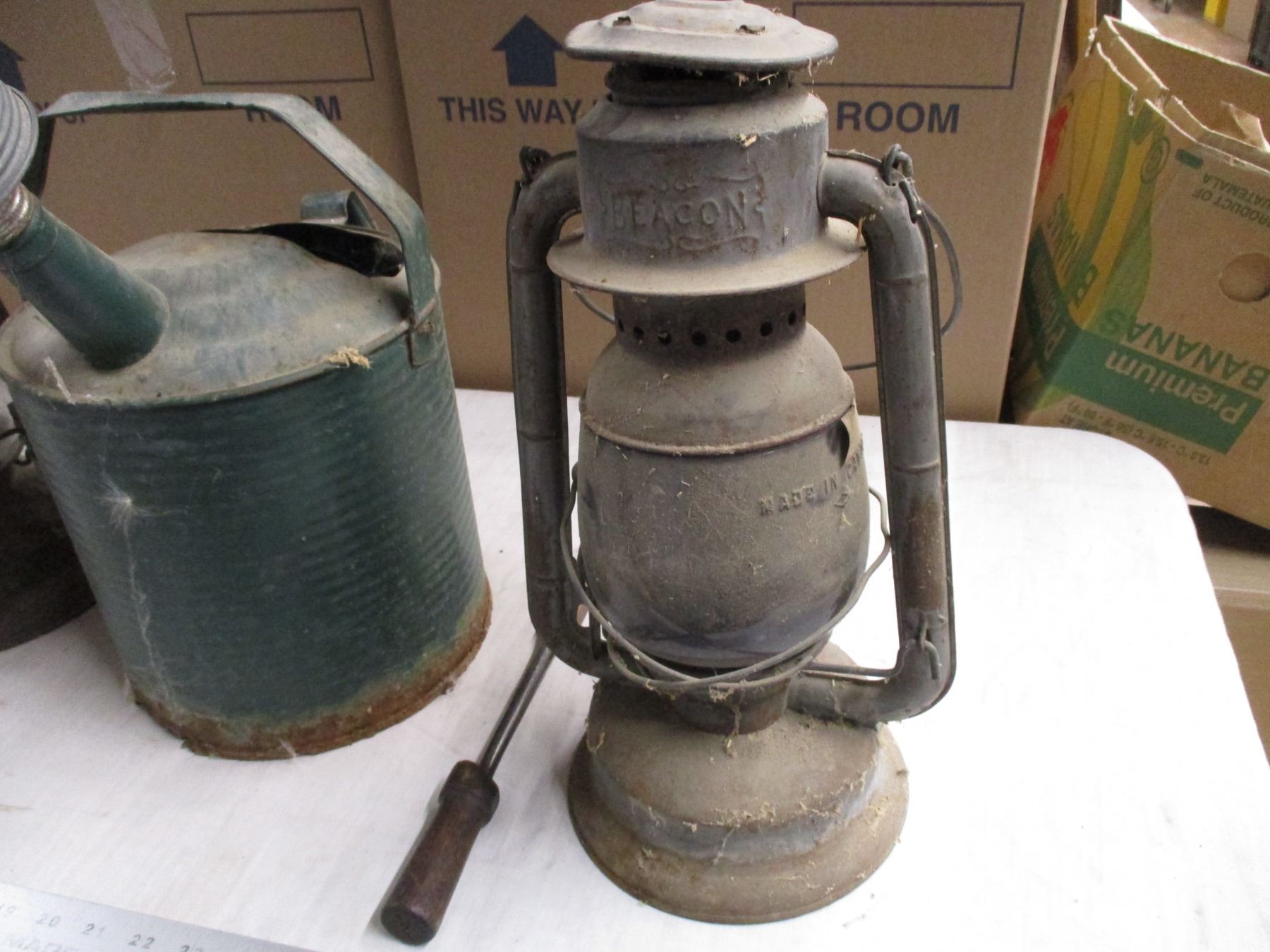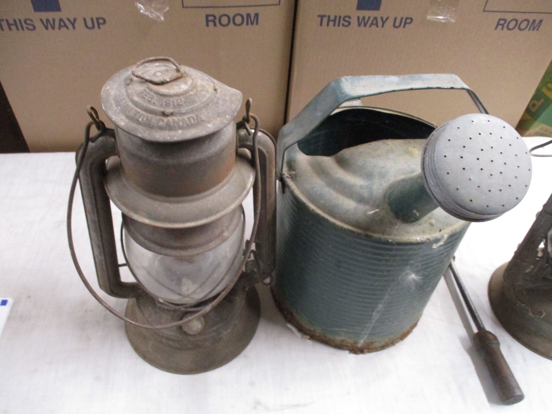 (2) Barn lanterns, watering can, misc