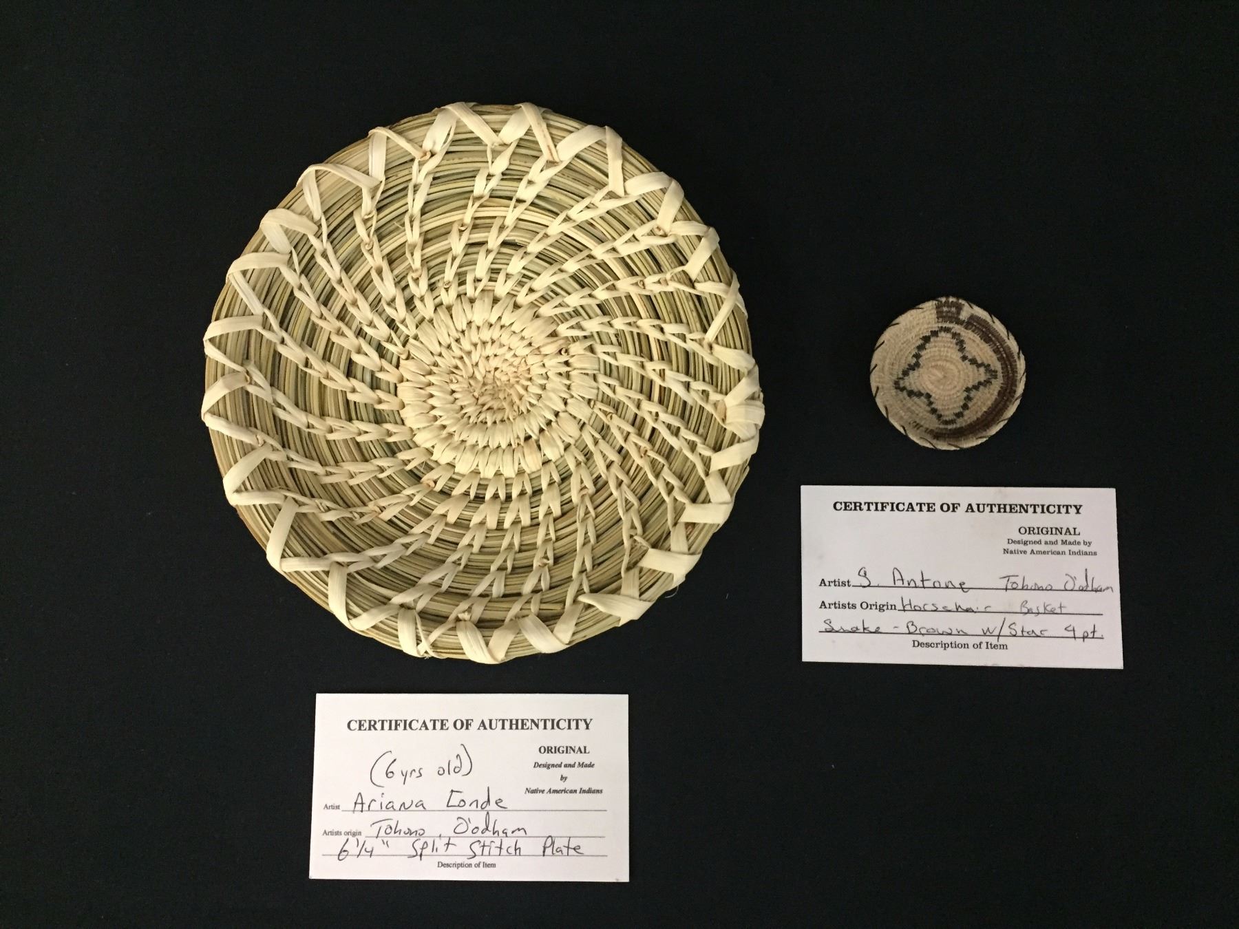 Maker: Both baskets were made by young, Tohono O’odham weavers and are their first baskets offered for sale. Weavers info comes with each basket. Approx. Age: Fairly recent. Size: Measure from 1 5/8” to 6 1/4” overall. Additional Info: 2 baskets, one of yucca, the other horsehair. Both are their first baskets and come with cards of authenticity. Condition: Good for their age, normal wear expected. Please look closely at the pictures - they are an important part of our description. Shipping: There will be a $5 handling / packaging fee for shipping this lot. The actual cost of postage will be added on top of that.