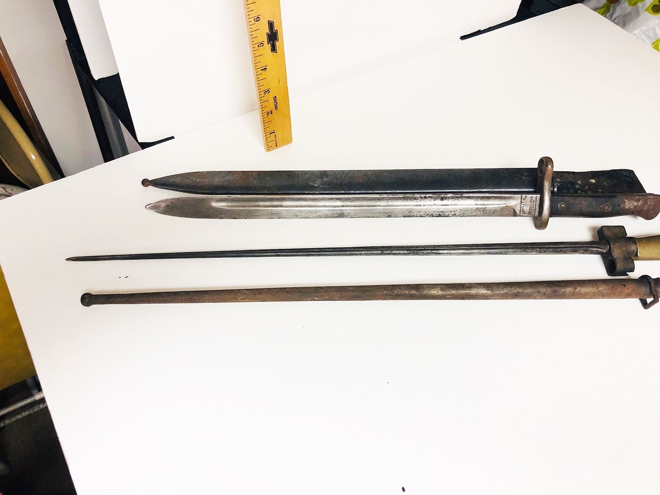 2 bayonets, one is a Spanish Rifle Bayonet from Toledo. marked ARTILLERIA Fca NACIONAL TOLEDO.
