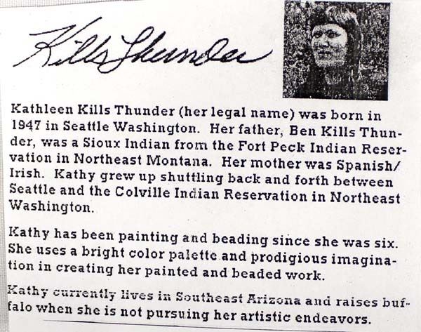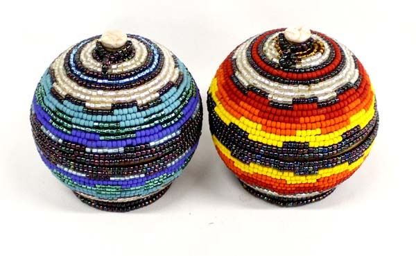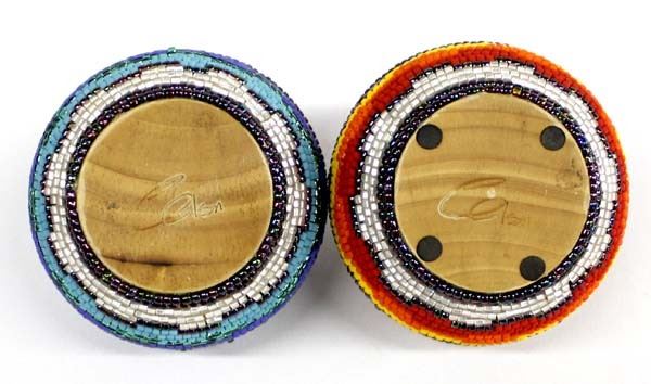 2 Hand Beaded Wood Lidded Trinket Boxes by Kathy Kills Thunder, largest measures 4.25''H x 4.25''D, both are beautifully bead in vibrant colors with stone cabochon embellished handles on lids, Artist Bio: Kathleen Kills Thunder (her legal name) was born in 1947 in Seattle, WA. Her father, Ben Kills Thunder, was a Sioux Indian from the Fort Peck Indian Reservation in NE Montana and her mother was Spanish/Irish. Kathy has been painting and beading since she was six.