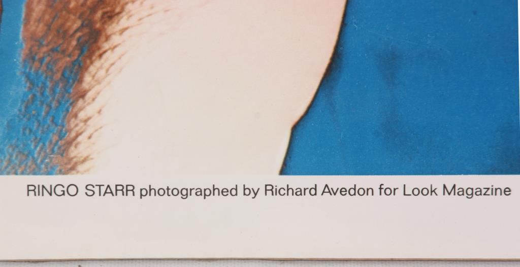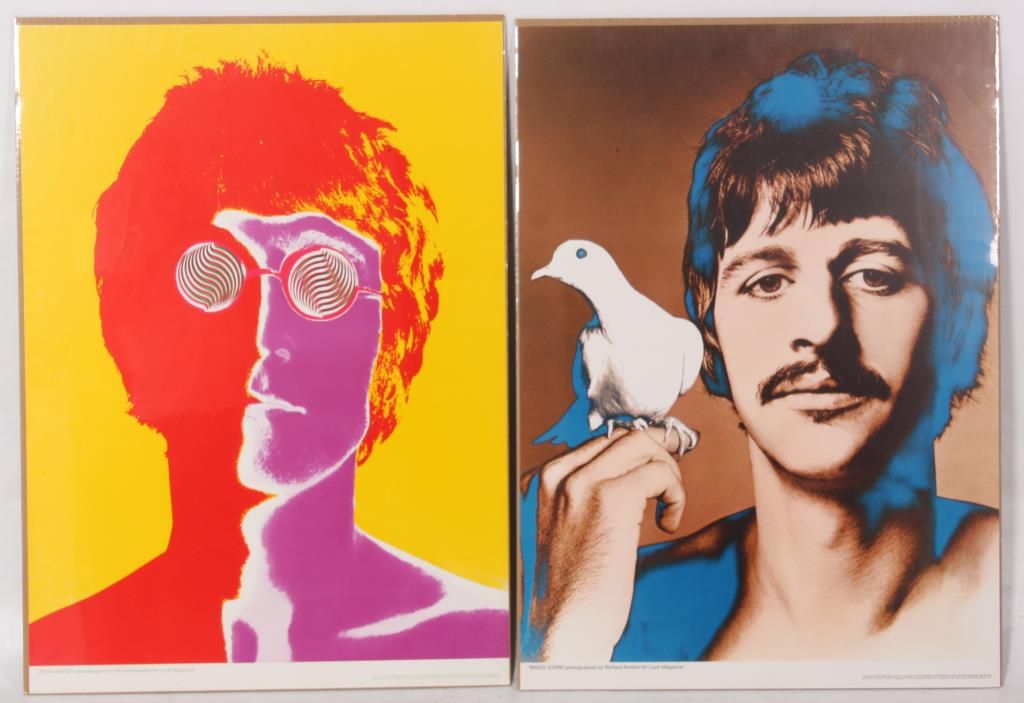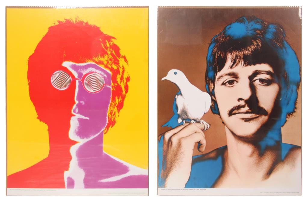2 Beetles Posters. Colorful poster of John Lennon, photographed by Richard Avedon for Look Magazine, Copyright 1967 by Nems Enterprise. The second is a photo poster of Ringo Starr, also photographed by Richard Avedon for Look Magazine and Copyrighted 1967 by Nems Enterprise. 31 in. high x 23 in. wide.