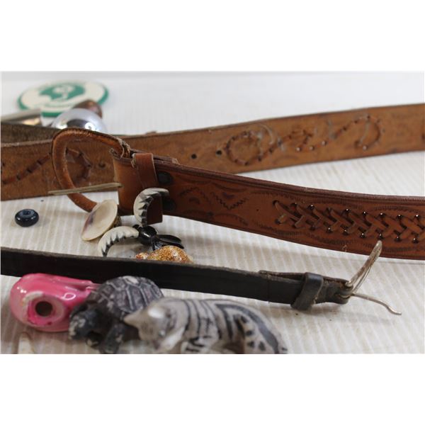 (2) Belts, Saskatchewan Roughriders Pin, Assorted Trinkets