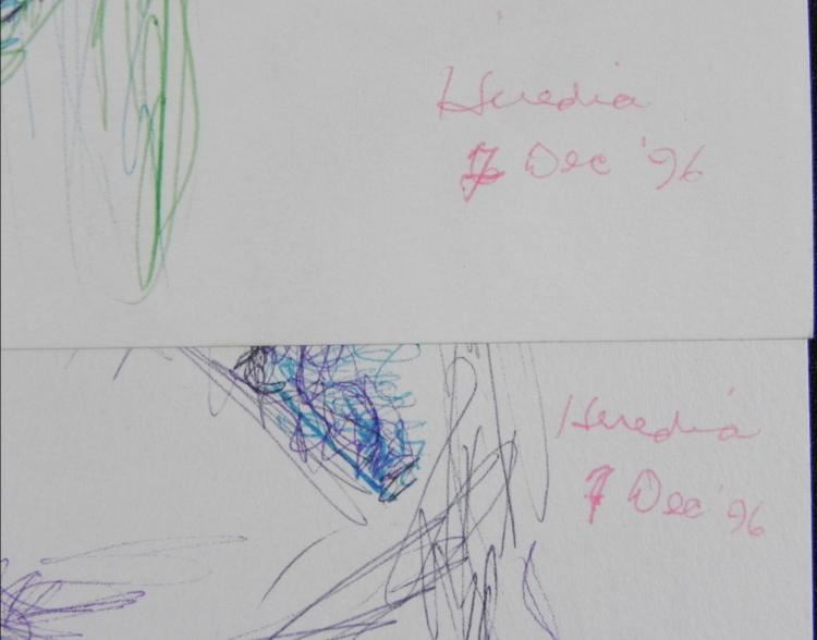 These two original nude figure drawings are done in dark purple, brighted by an array of colors, bringing emotion to the form. Artist: Elizabeth HerediaSignature: "Heredia," in red ink, lower rightMedium: Colored ink on sketchbook paperSheet size: 9 x 12 inches Date: 7, December, 1996Condition: Excellent Certificate of Authenticity: Included Midwest Estate Buyers has been entrusted by the estate of Elizabeth (Betty) Heredia (Shapiro) Snyder Rees to offer her personal artwork for public sale. Due to the rapidity that Elizabeth's artwork was sold commercially, this represents a treasure trove of her personal work as submitted by her son. It was her wish and legacy that others should enjoy what she enjoyed. Elizabeth's previous work was sold as rapidly as it became available. We consider this a unique opportunity to take recognition of an enormous talent. Her personal portfolios have now been opened up to reveal a variety of marvelous work, full of color and expression. As in the past, her work has appreciated considerably with time. Betty was a multi-dimensional artist. She was well versed in classic oil painting, water color, wax pencil, charcoal, sumi ink, drawing, hand made paper sculpture, paper mache, clay, wood, marble, printmaking, wood cuts, linoleum block, etching, monotype, serigraph, and multi-media silk screen. Elizabeth attended the Tyler School of Art at Temple University, and studied under the founder, Boris Blai, and printmaker Arthur Flourie. Her work was first shown in California at Stanford University Museum of Art on campus. Many pieces were gifted to museums, including the Palace of the Legion of Honor, San Francisco, CA; Oakland Museum, Oakland, CA; Grand Rapids Museum of Art, Grand Rapids, MI; and according to the estate, the National Museum of American History Art Smithsonian Institution, Washington, DC. She received a deed of gift, certificate number 26800, dated 8/17/2001. Betty's work was known on the San Francisco Peninsula through the San Francisco Women Artists and Bay Area Printmakers Society and was juried into the California State Fair in 1956 and 1957. Betty taught at the Pacific Grove Art Center, and the Monterey Museum of Art, and also had exhibits of her work at these fine institutions. She was featured in a one person show at the Cherry Foundation in Carmel. She was compared to the then greatest living Cubist artist Richard Diebenkorn. Gehan Salinger, art critic of the San Francisco Chronicle for 25 years, referred to Elizabeth as "an unqualified genius." Her art has sold in galleries in Amsterdam and Barcelona to Europeans for their personal collections for many years. She had a solo show in Tokyo, Japan, and another in Denmark. A few of her pieces can be found in public art schools. Also, an oil painting of a marching band is in a special school for the deaf in Daley City, California. Betty passed away at the age of 91. She left behind her wonderful collection of original art. We are glad to bring it to you at what we consider to be very competitive opening bids for such fine artwork.