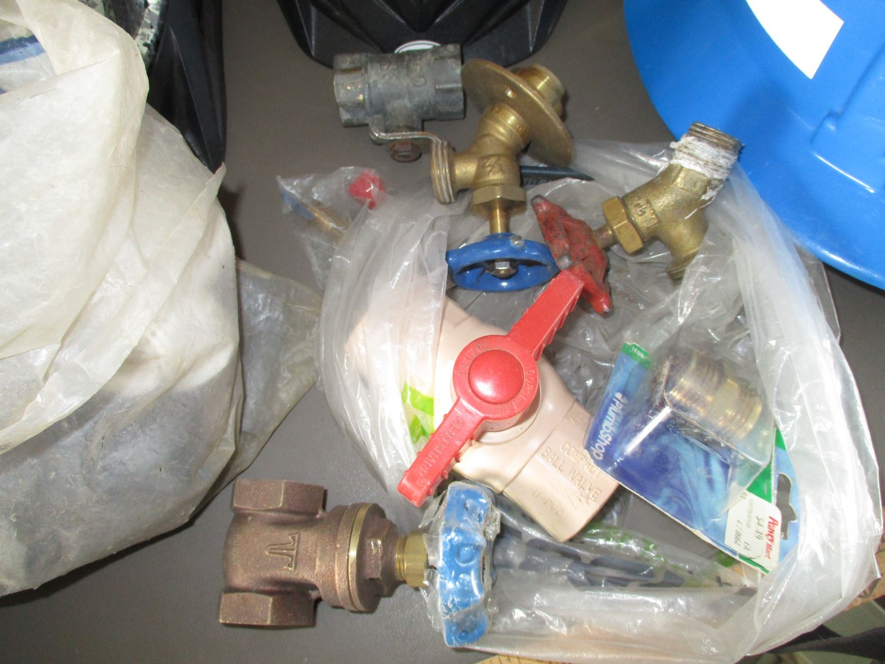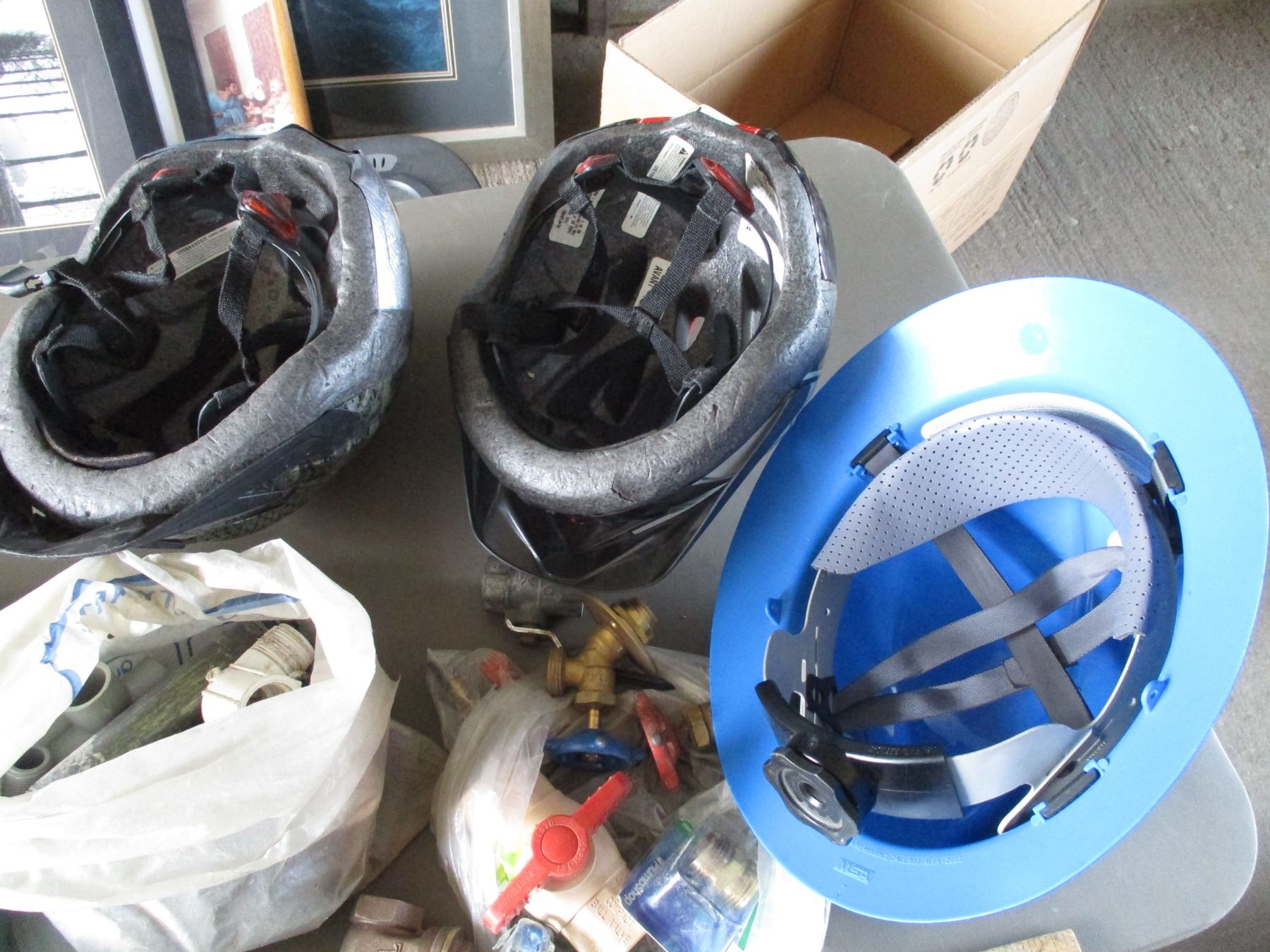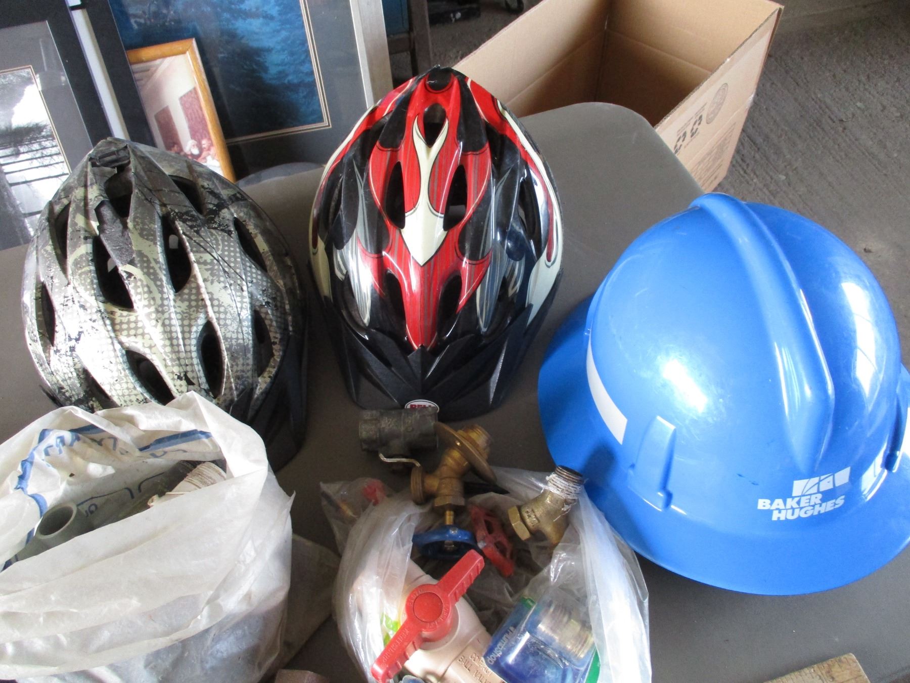 (2) Bicycle Helmet's, Rigger Style Hard Hat, Typewriter, Various Plumbing Fittings (Hose Bibbs, Valv