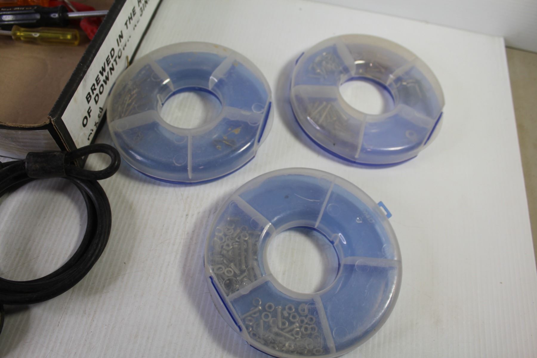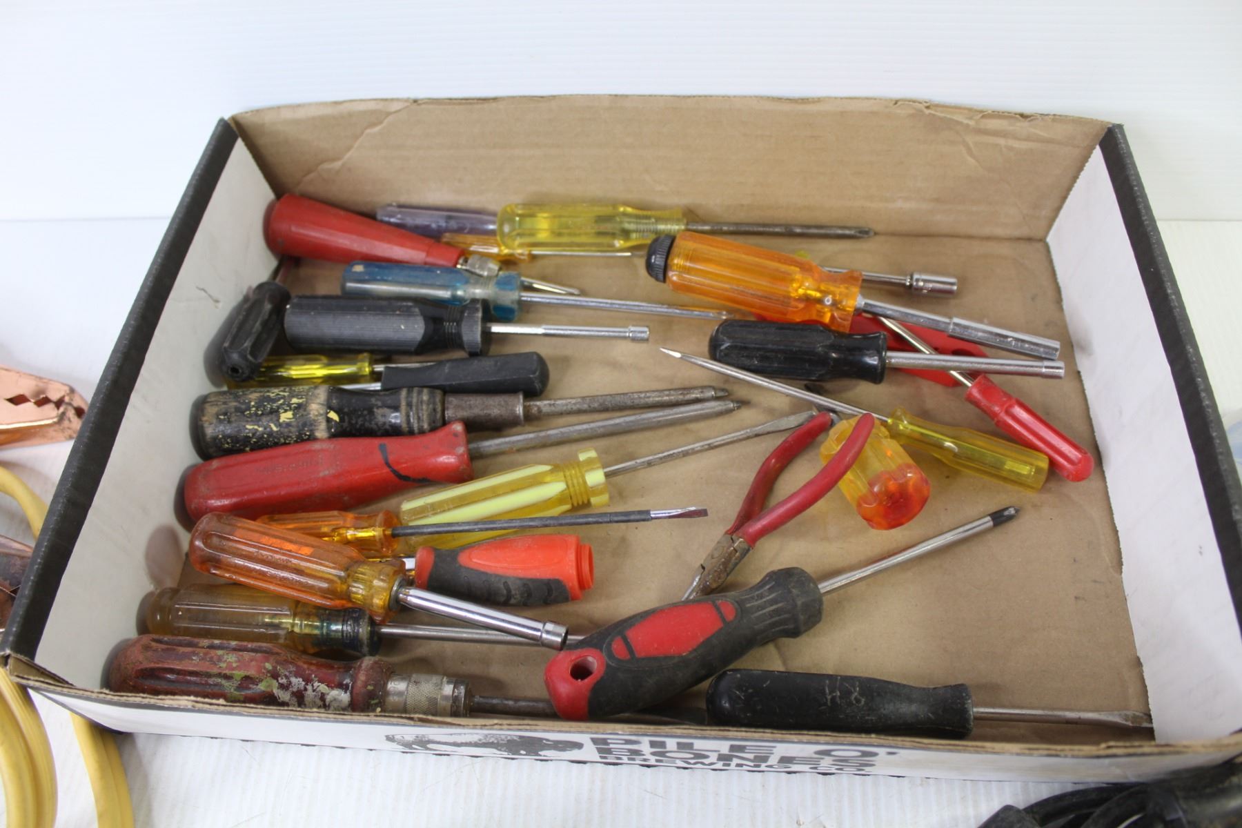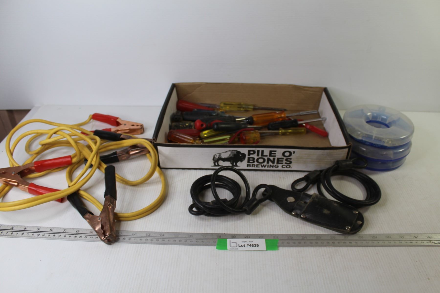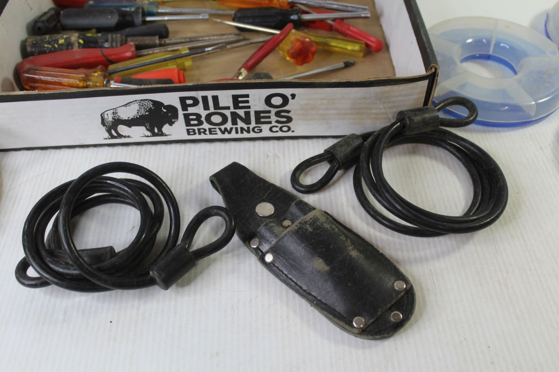 (2) Bike Lock Cables - (2) Screw Organizers - Booster Cables - Assorted Screw Drivers - Tool Holder