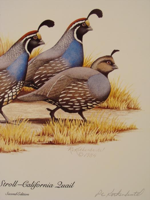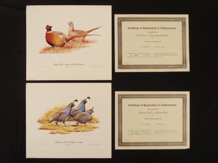 Artist: R.L. Kothenbeutel Titles: Afternoon Stroll-California Quail; Royal Pair- Ring-necked PheasantsSheet size: 11" x 12 1/2".Edition: SecondYear: 1984Numbers: Both are 18,481/20,000Condition: ExcellentCertificate of Authenticity: From Wild Images, Inc.