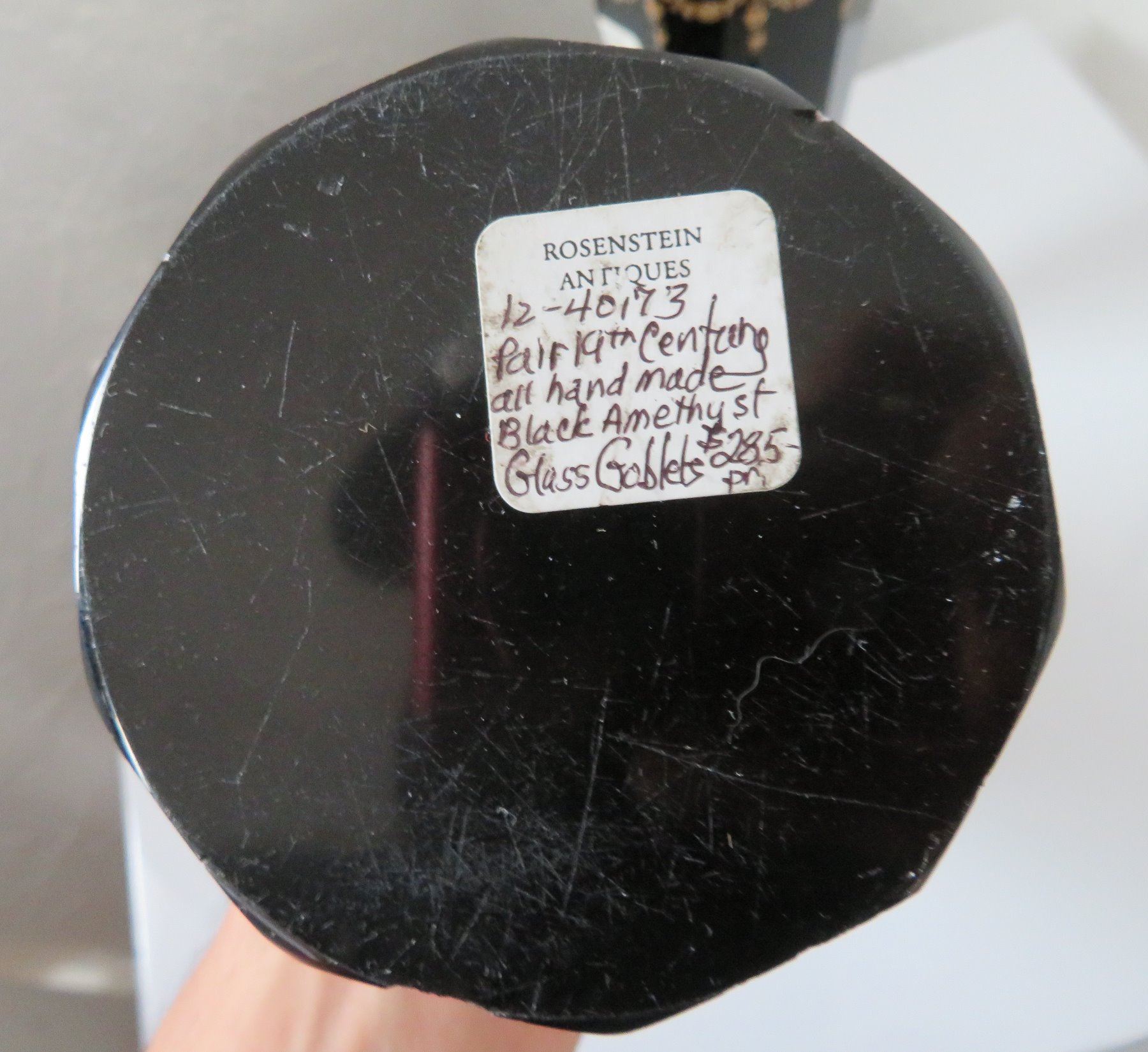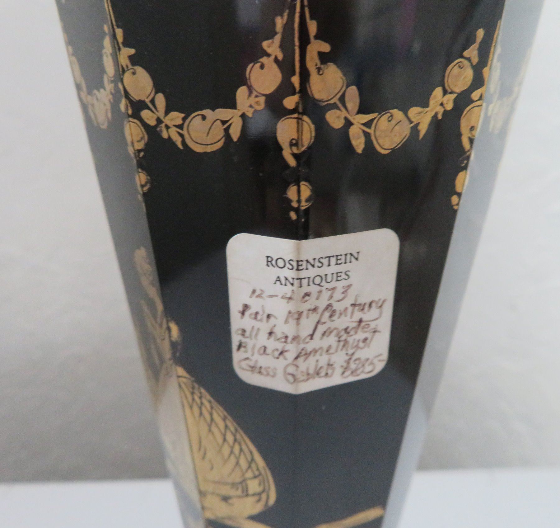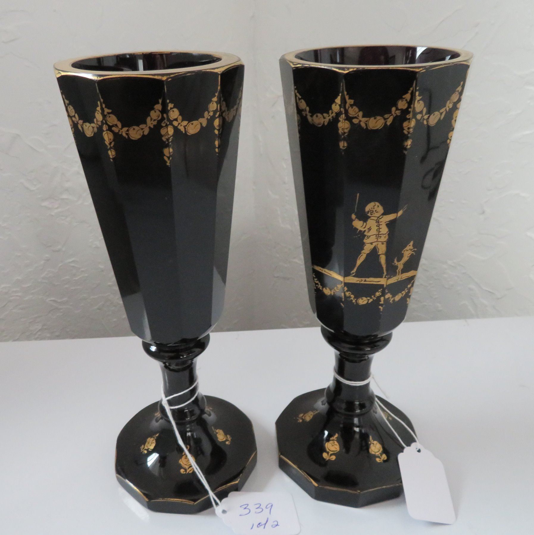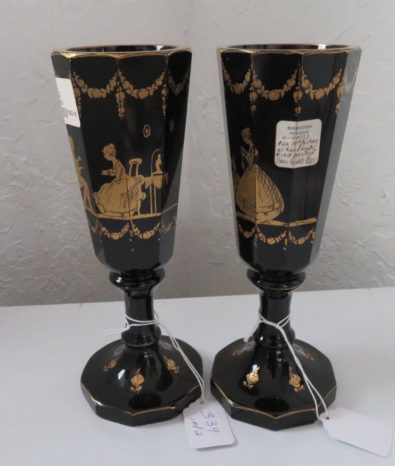 2 Black Amethyst Goblets, 19th century items. Made of brass and paint, the items measure 9" tall x 3". European. Nice handpainted goblets with gold figures and flowers. Condition: Good, some wear, see images. Shipping: $28.50 w/insurance and signature, due to weight and value.