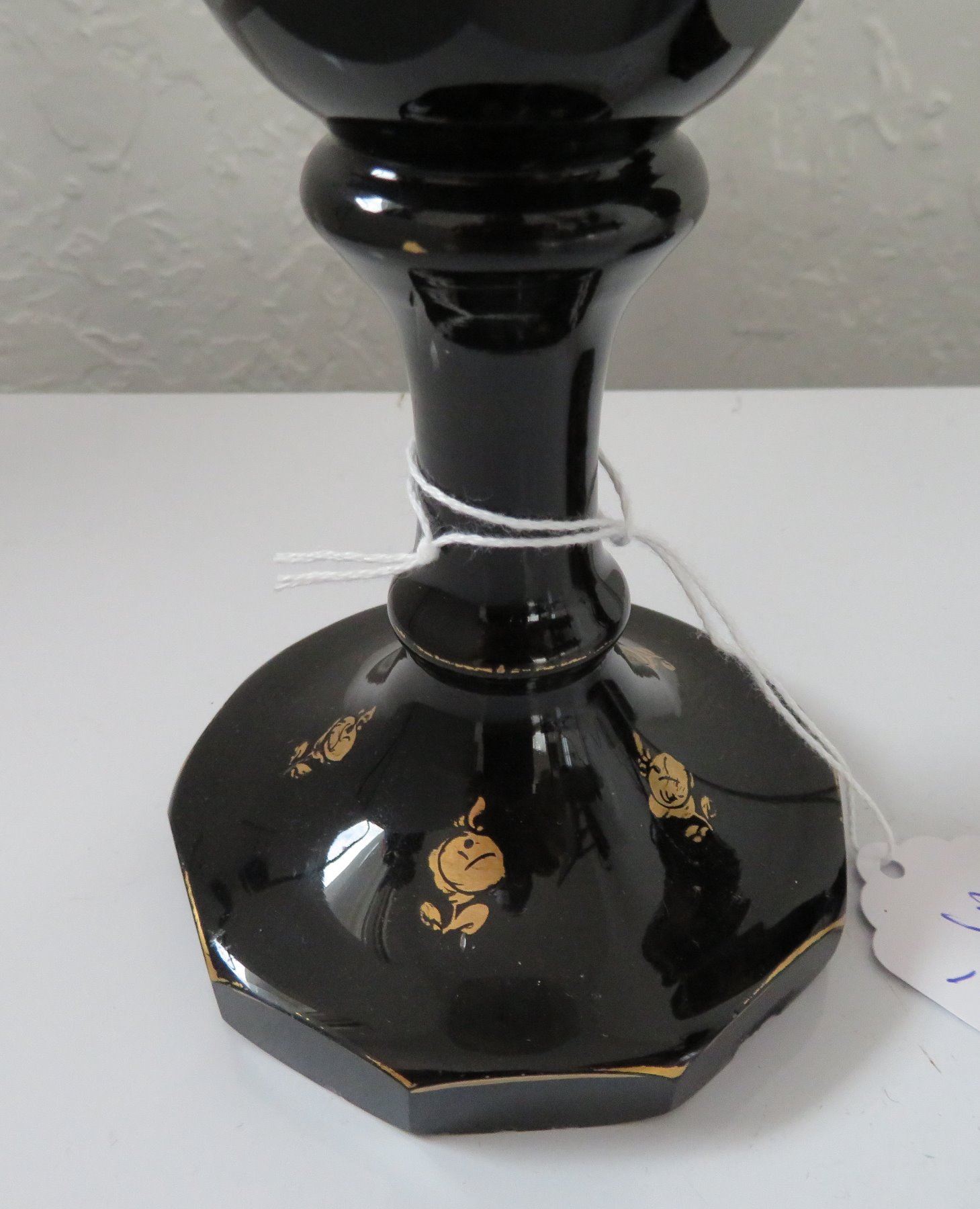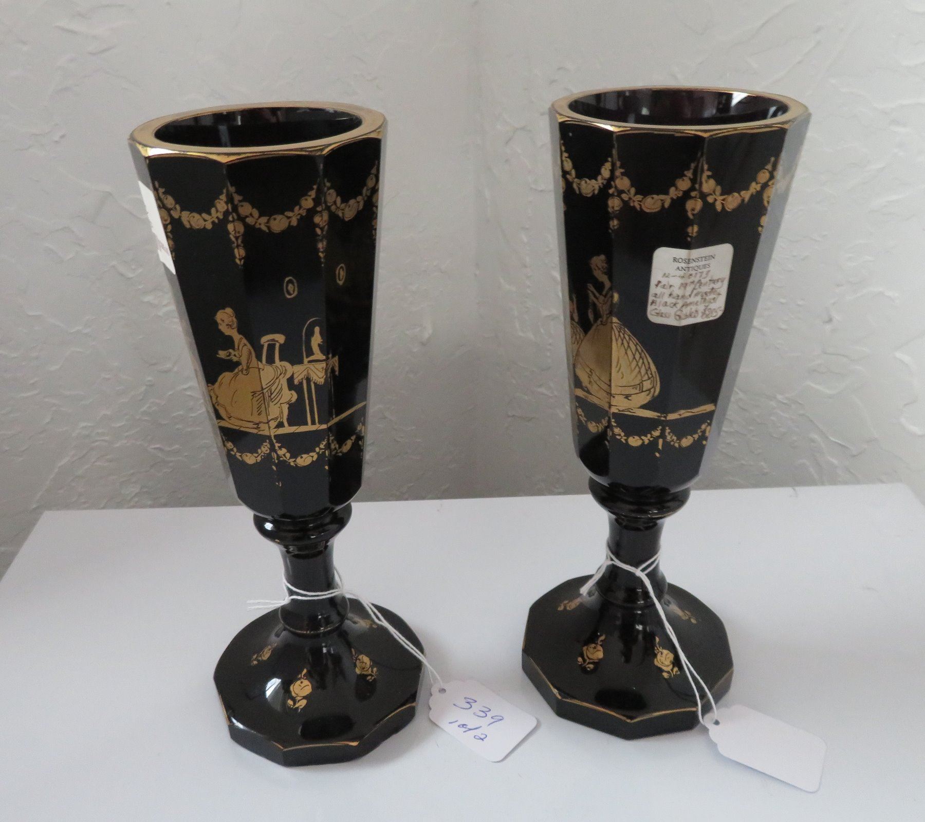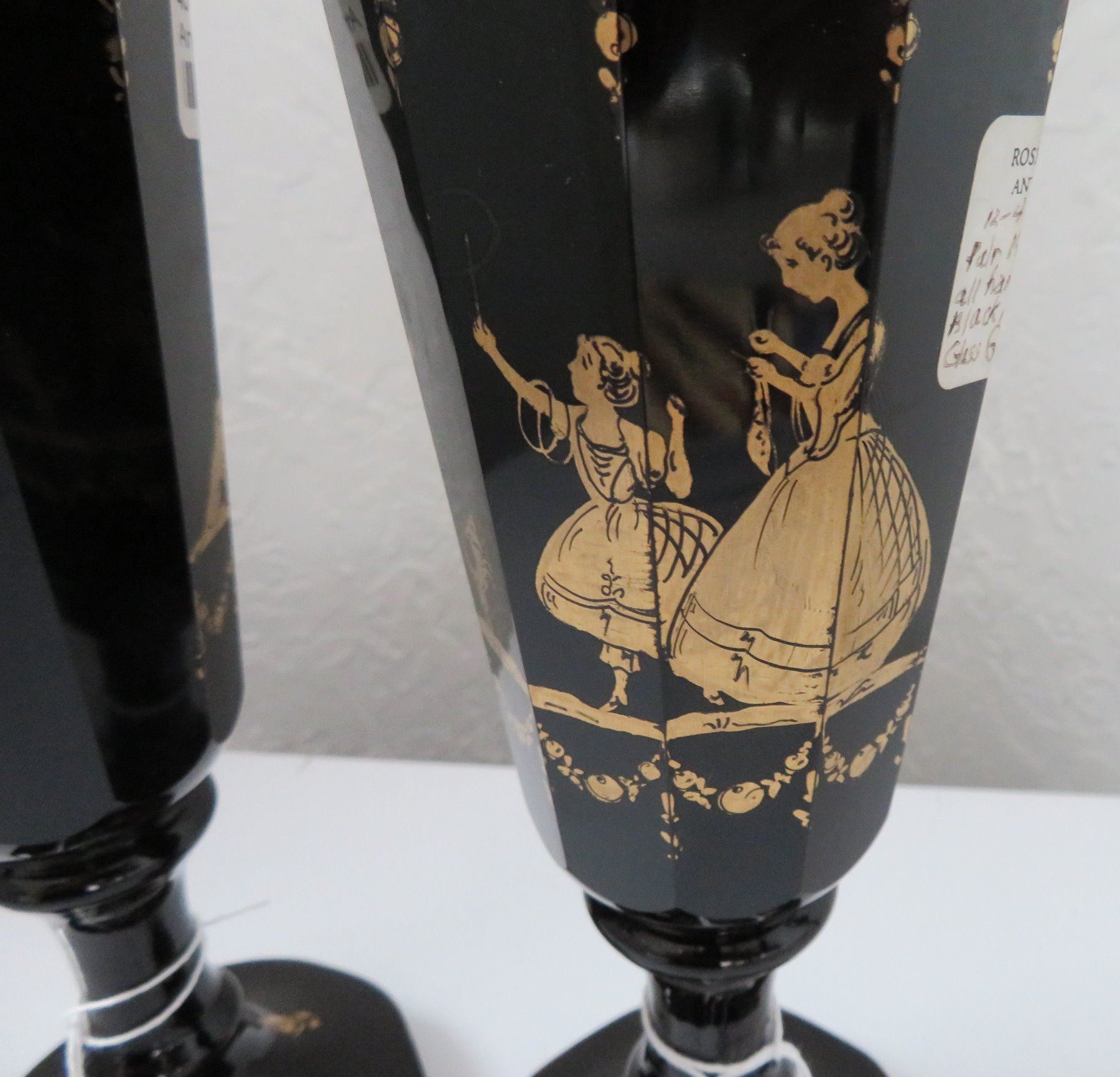 2 Black Amethyst Goblets, 19th century items. Made of brass and paint, the items measure 9" tall x 3". European. Nice handpainted goblets with gold figures and flowers. Condition: Good, some wear, see images. Shipping: $28.50 w/insurance and signature, due to weight and value.
