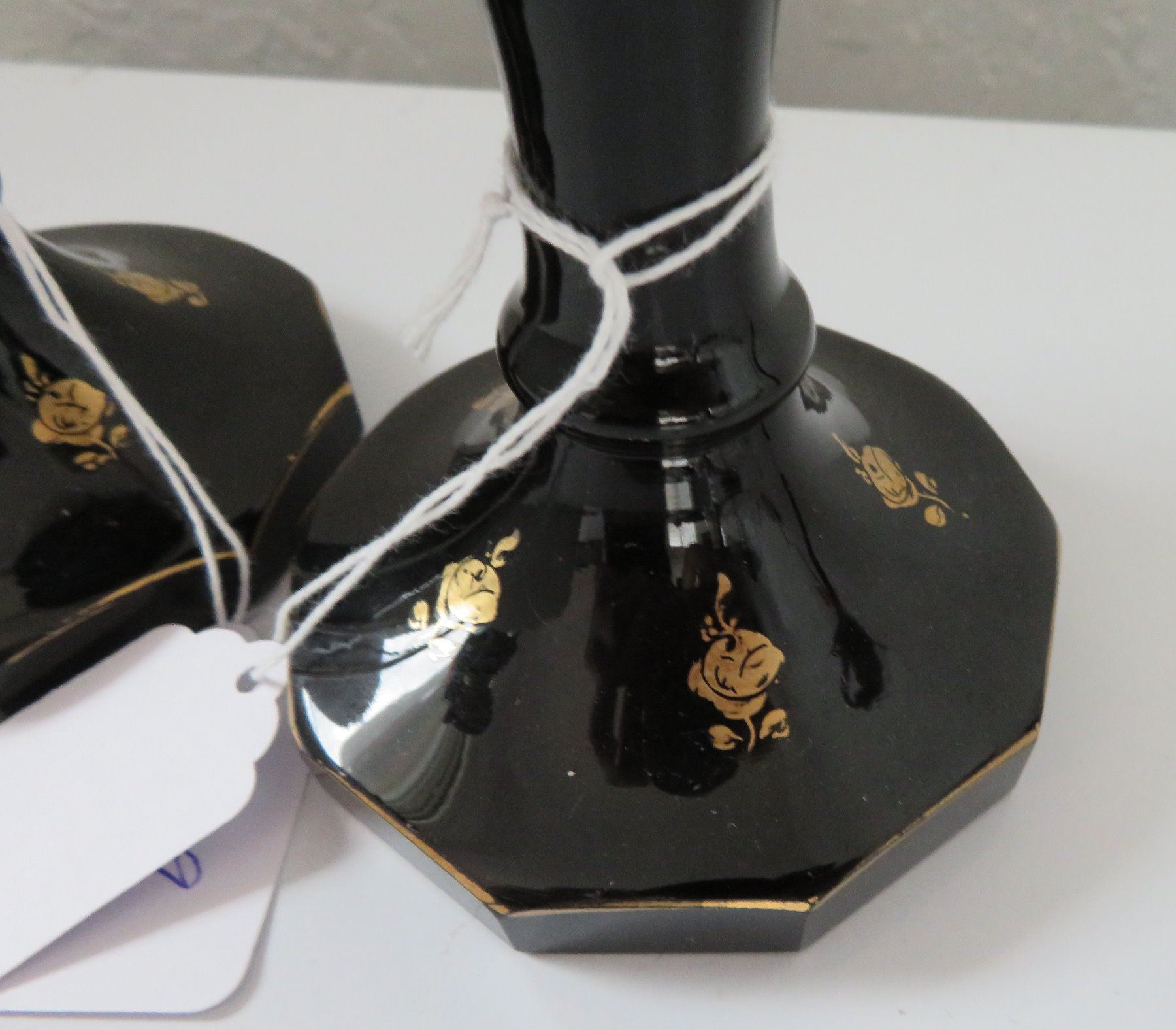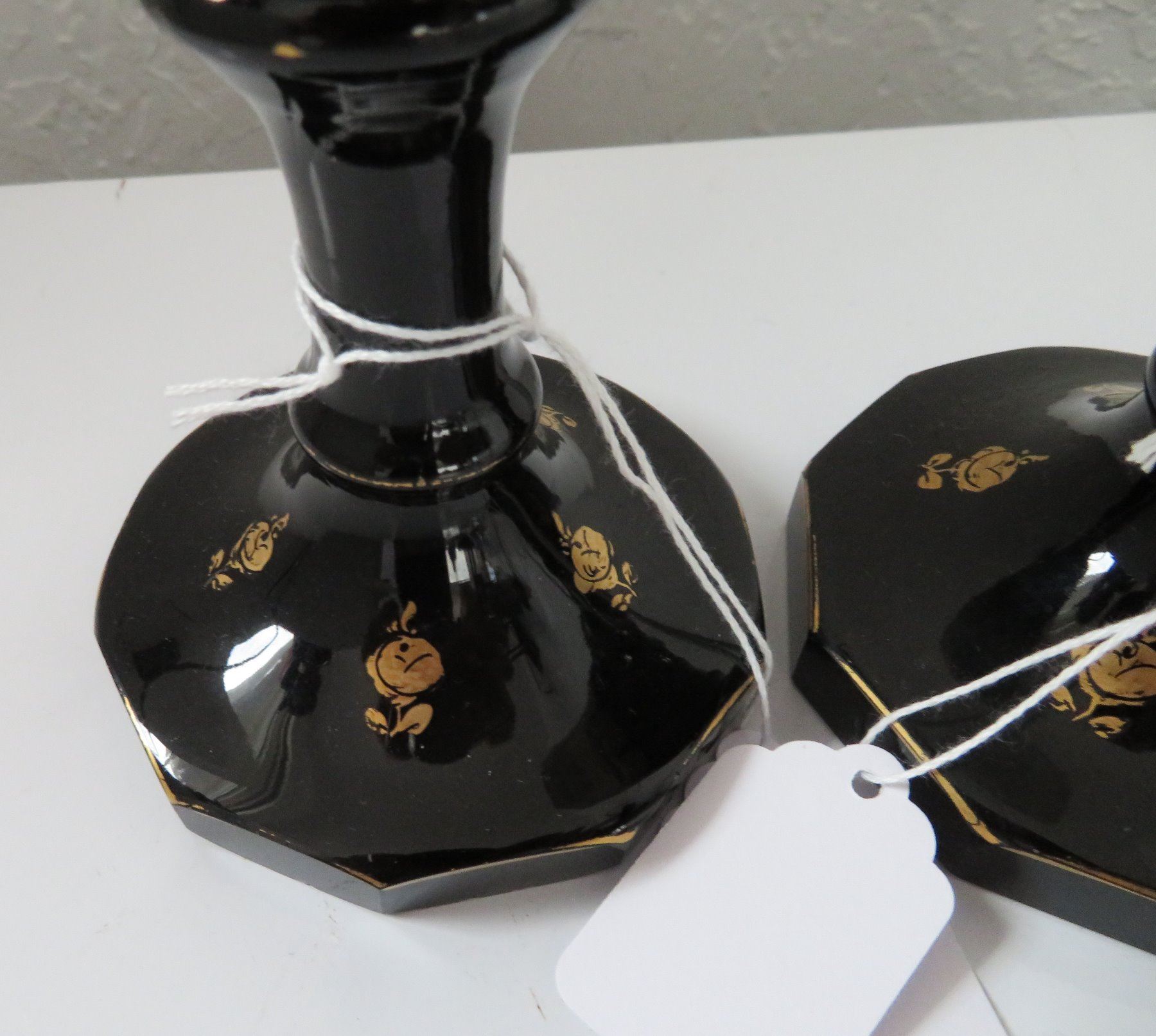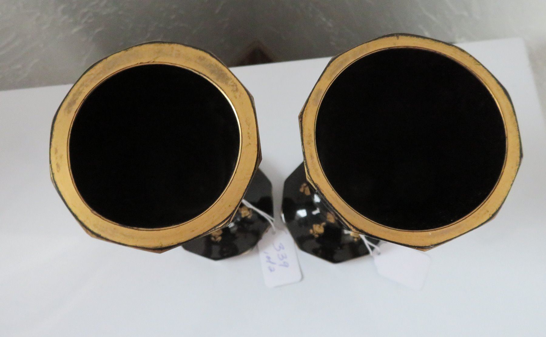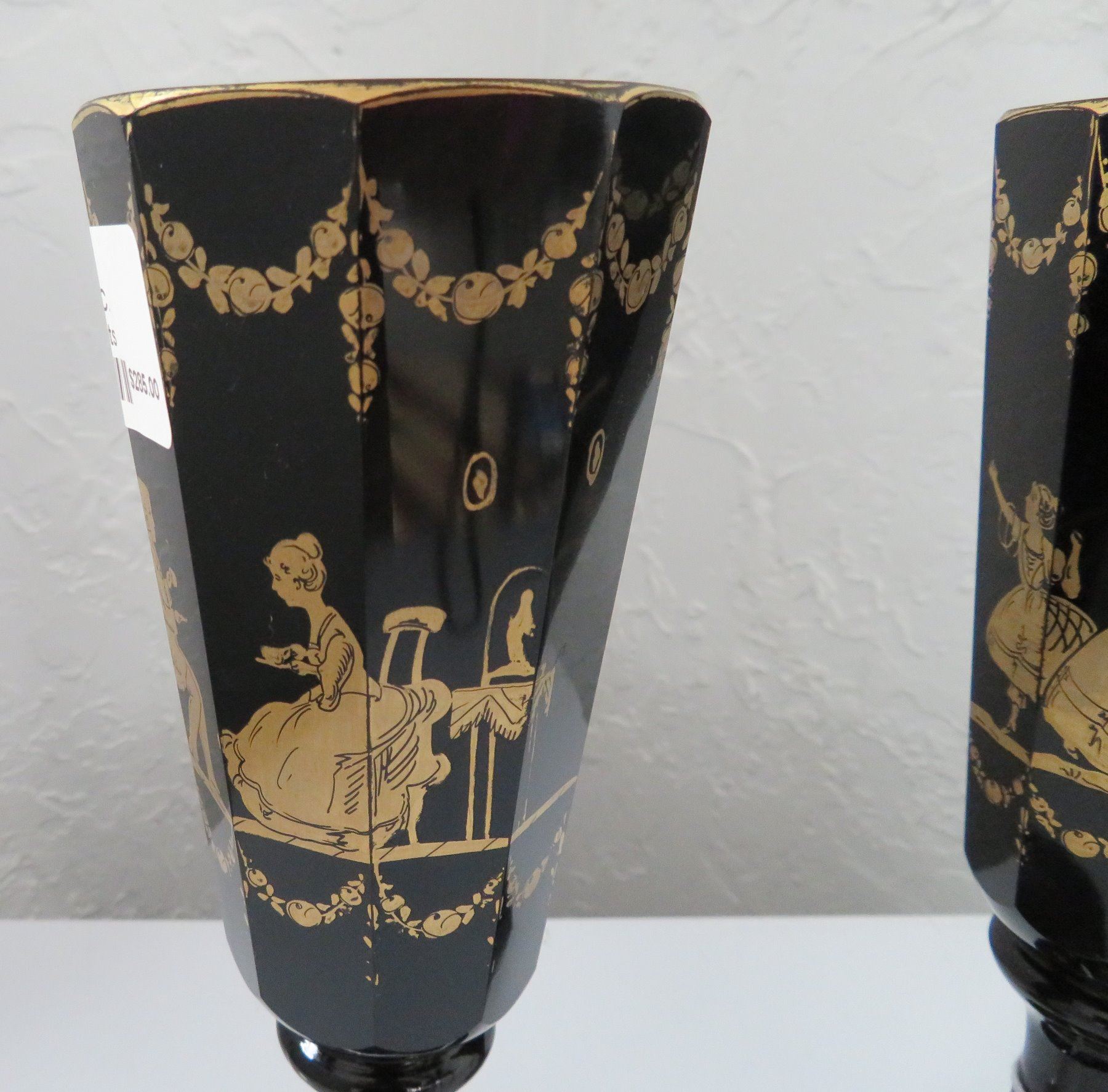 2 Black Amethyst Goblets, 19th century items. Made of brass and paint, the items measure 9" tall x 3". European. Nice handpainted goblets with gold figures and flowers. Condition: Good, some wear, see images. Shipping: $28.50 w/insurance and signature, due to weight and value.