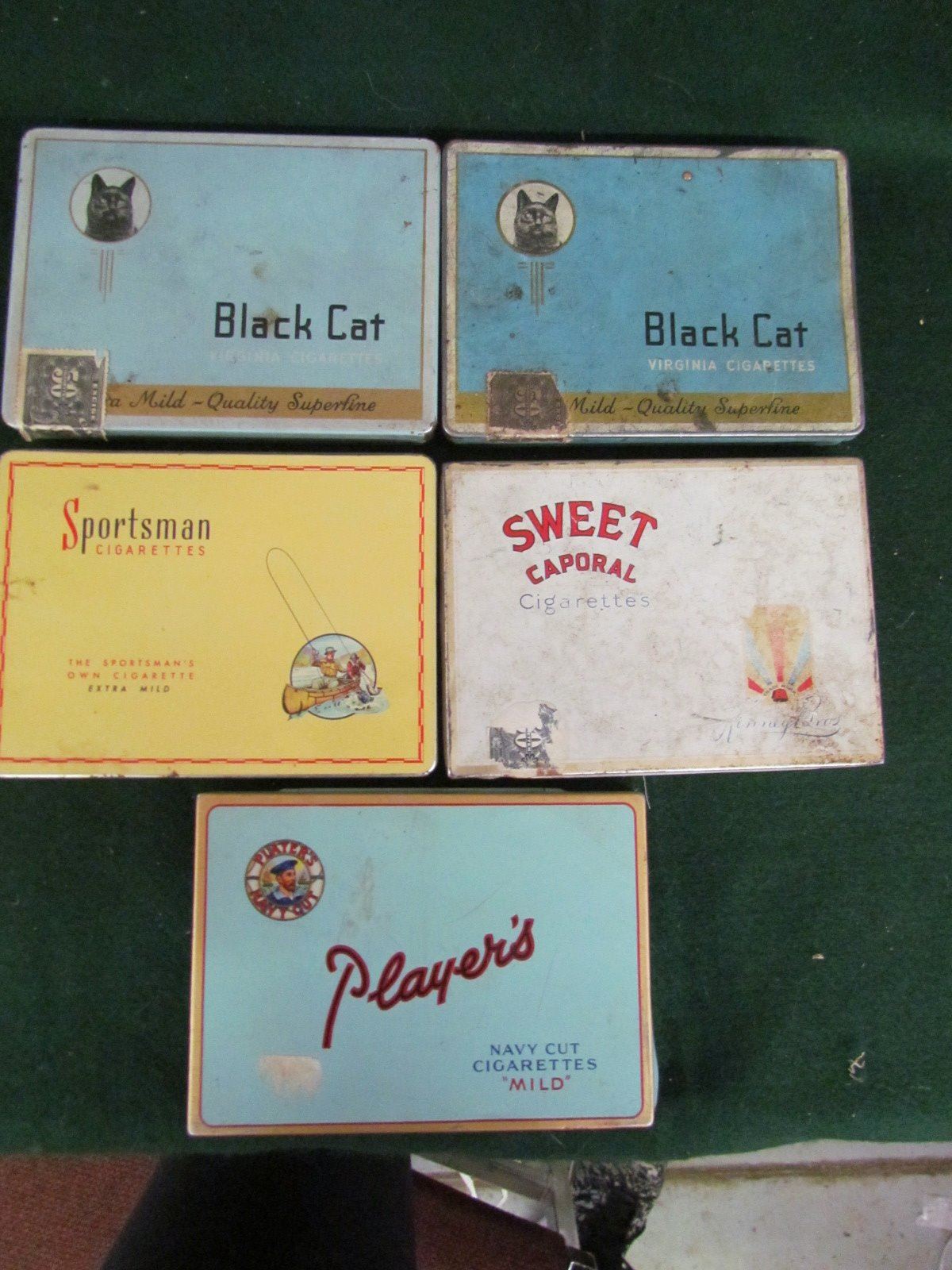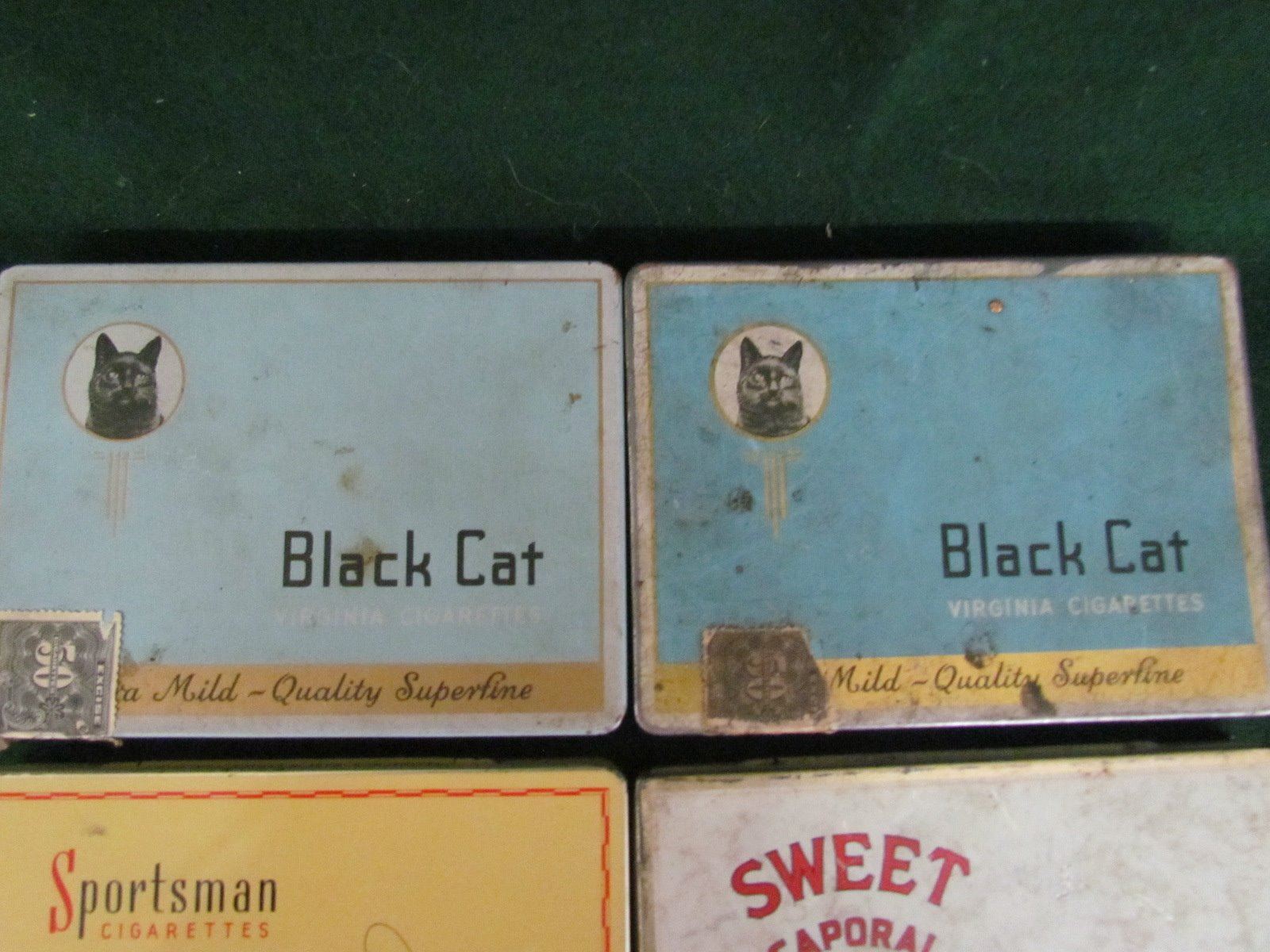2 Black Cat, Sweet Caporal, Player's, Sportsman cigarette tins 6 x 4 1/4
